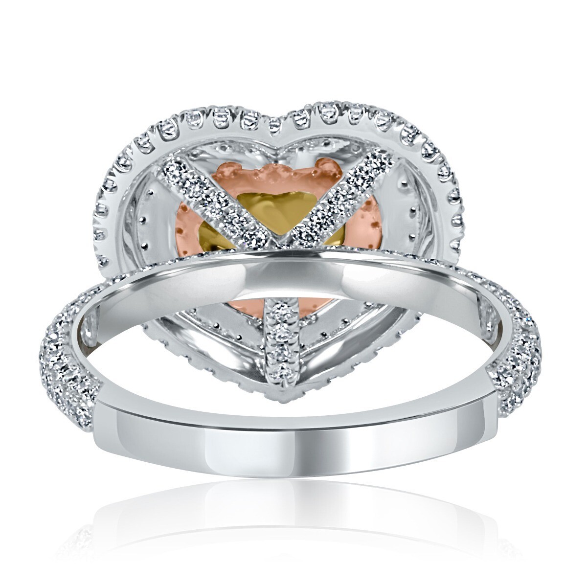 ¡Este anillo es una forma hermosa y única de expresar tu amor! El diamante en forma de corazon es un símbolo de amor, y el color amarillo del diamante representa la pasion. Los diamantes rosados ??e incoloros en el halo agregan un toque de elegancia y sofisticacion. El oro de dos tono le da al anillo un aspecto moderno y contemporaneo.