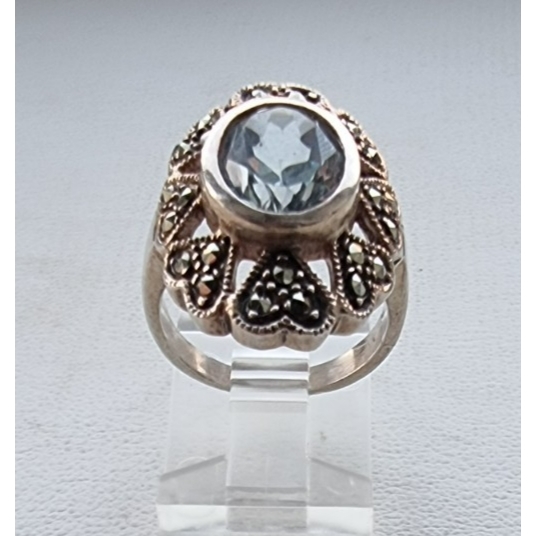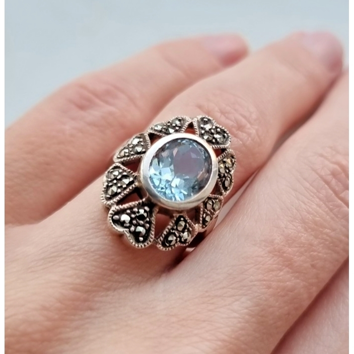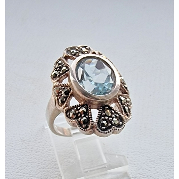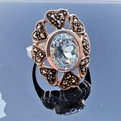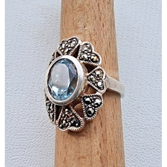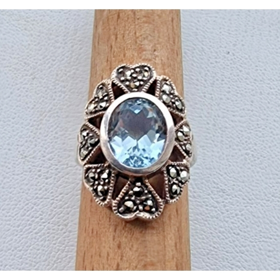 ART DECO 925 STERLING SILVER BLUE TOPAZ AND MARCASITE FLOWER RING SIZE 5.75 AT