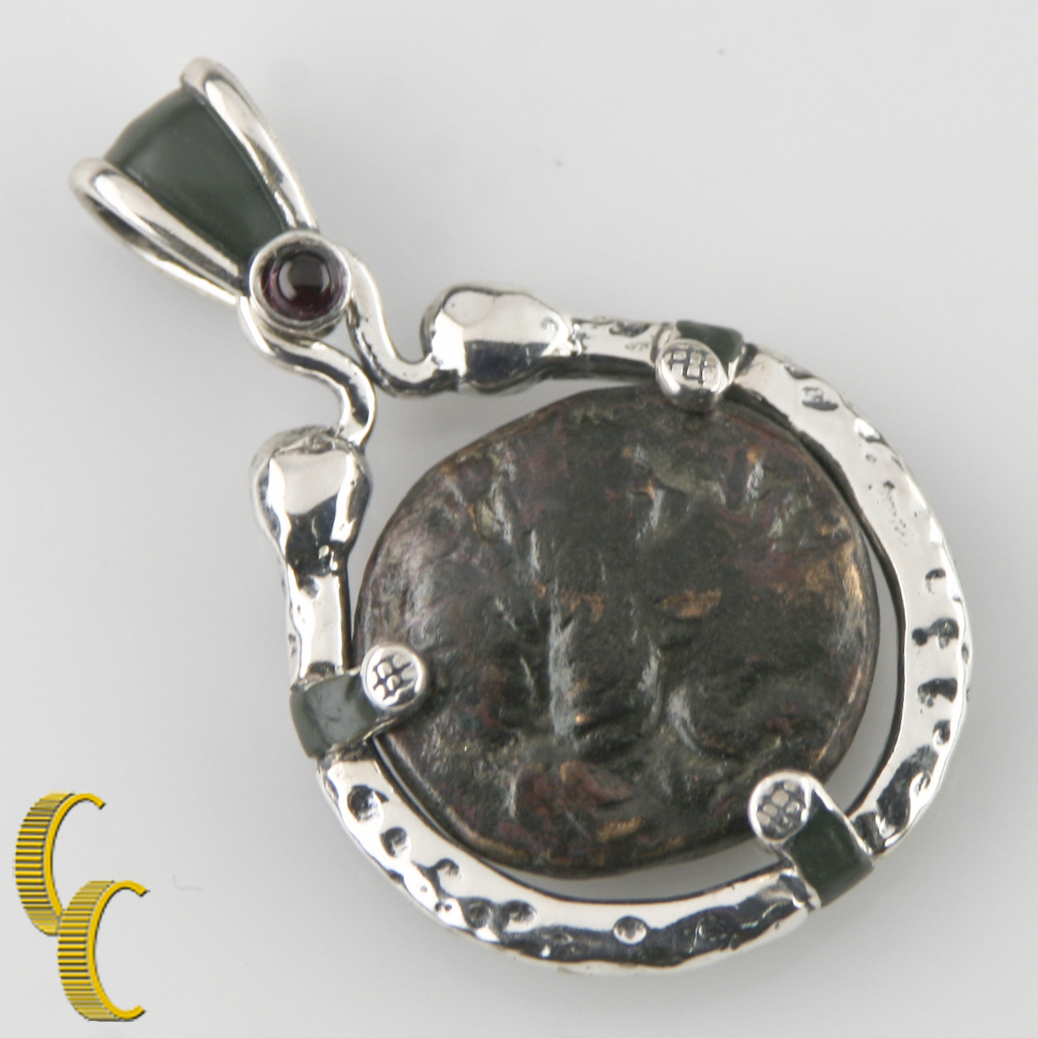 ANCIENT GREEK COIN IN SILVER BEZEL WITH RUBY CABOCHON PENDANT