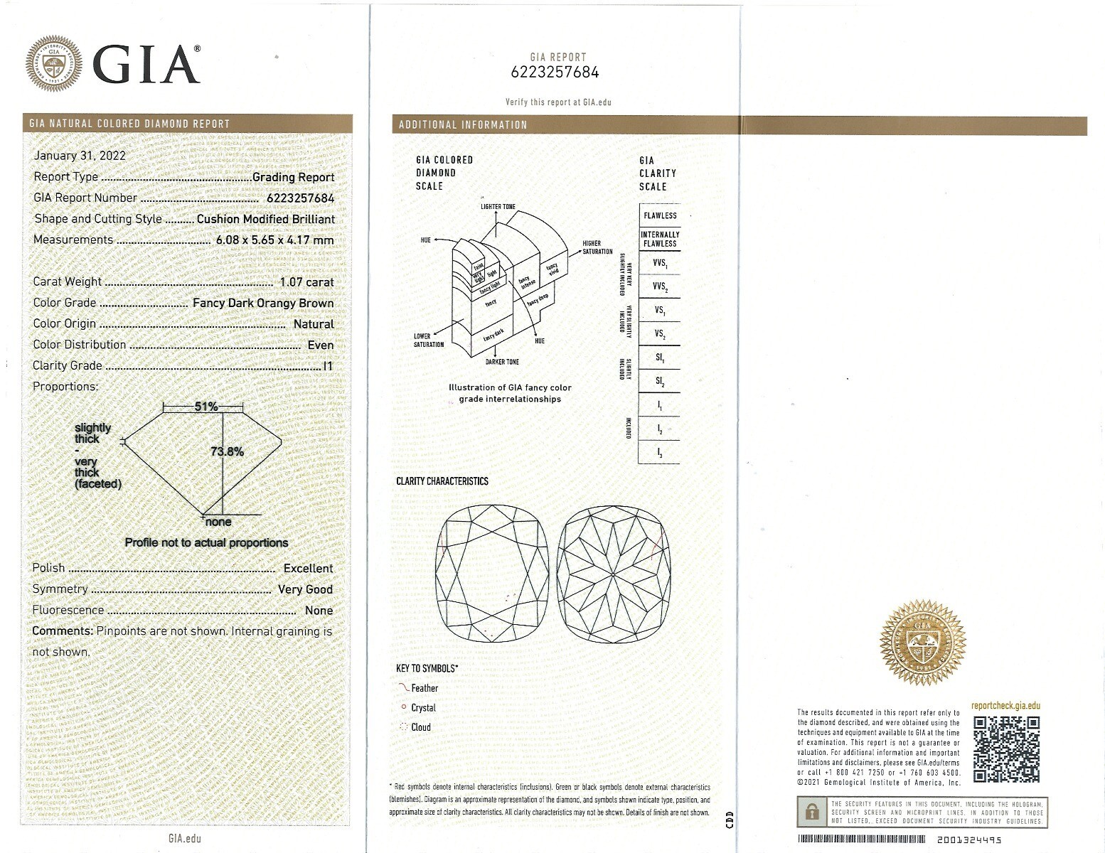 C'est une facon parfaite de dire - je t'aime - avec cette magnifique bague en diamant !! Cette bague de fiancailles en diamant comprend une cartouche de 1,07 (6,08 * 5,65 * 4,17 mm) GIA Certifie Natural Fancy Orangy Brun Cushion modifie Diamond coupe brillant complete par un halo de diamants rond a coute rond incolore. Fabrique a la main en or blanc de 14 carats. La tige classique avec des diamants etincelants incolores complete un design. Le poids total des carats est de 1,88 carats.