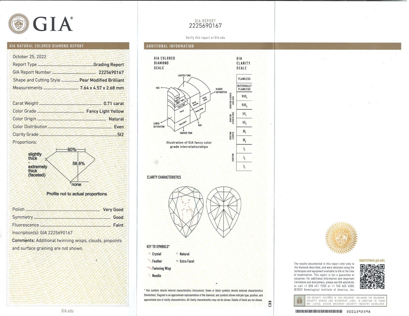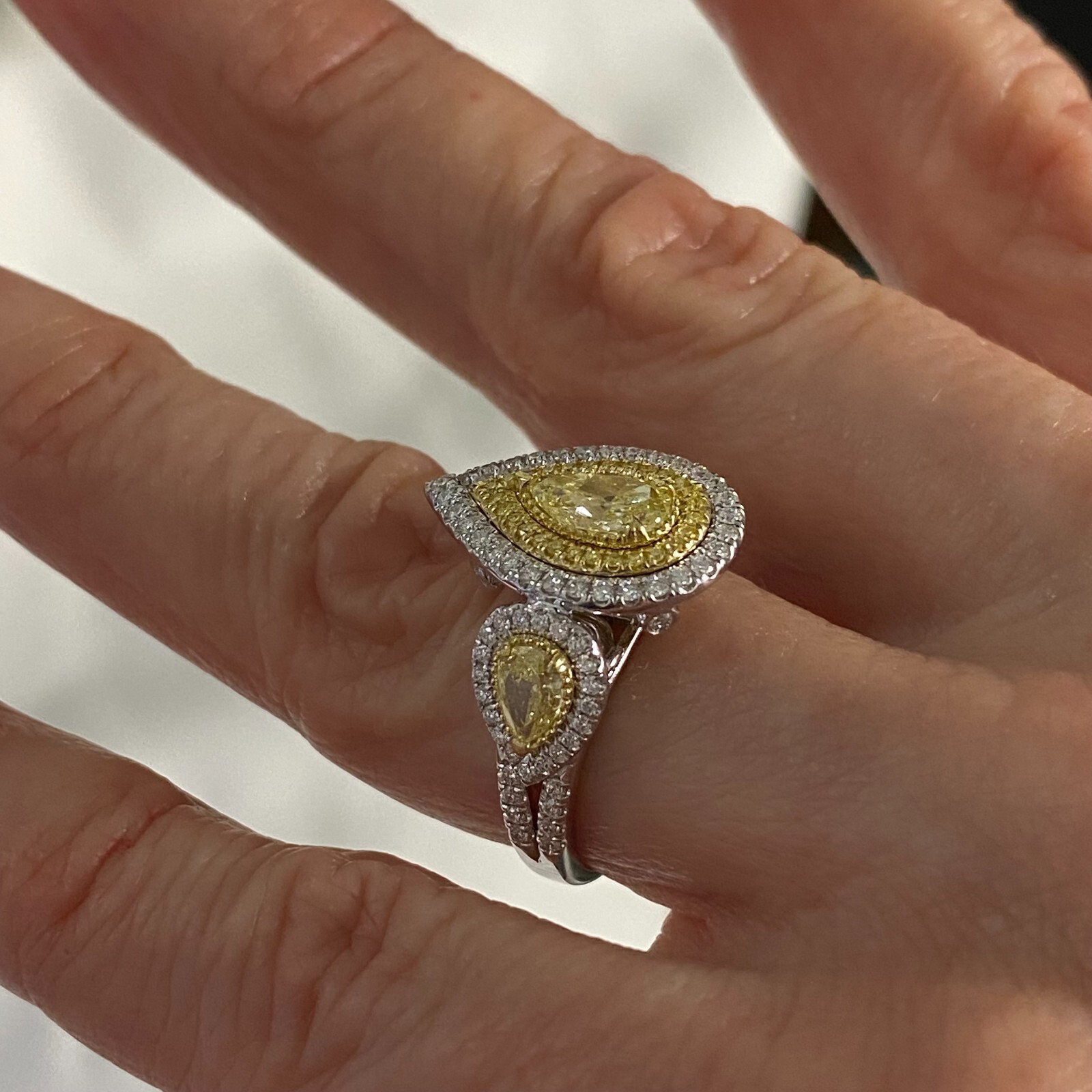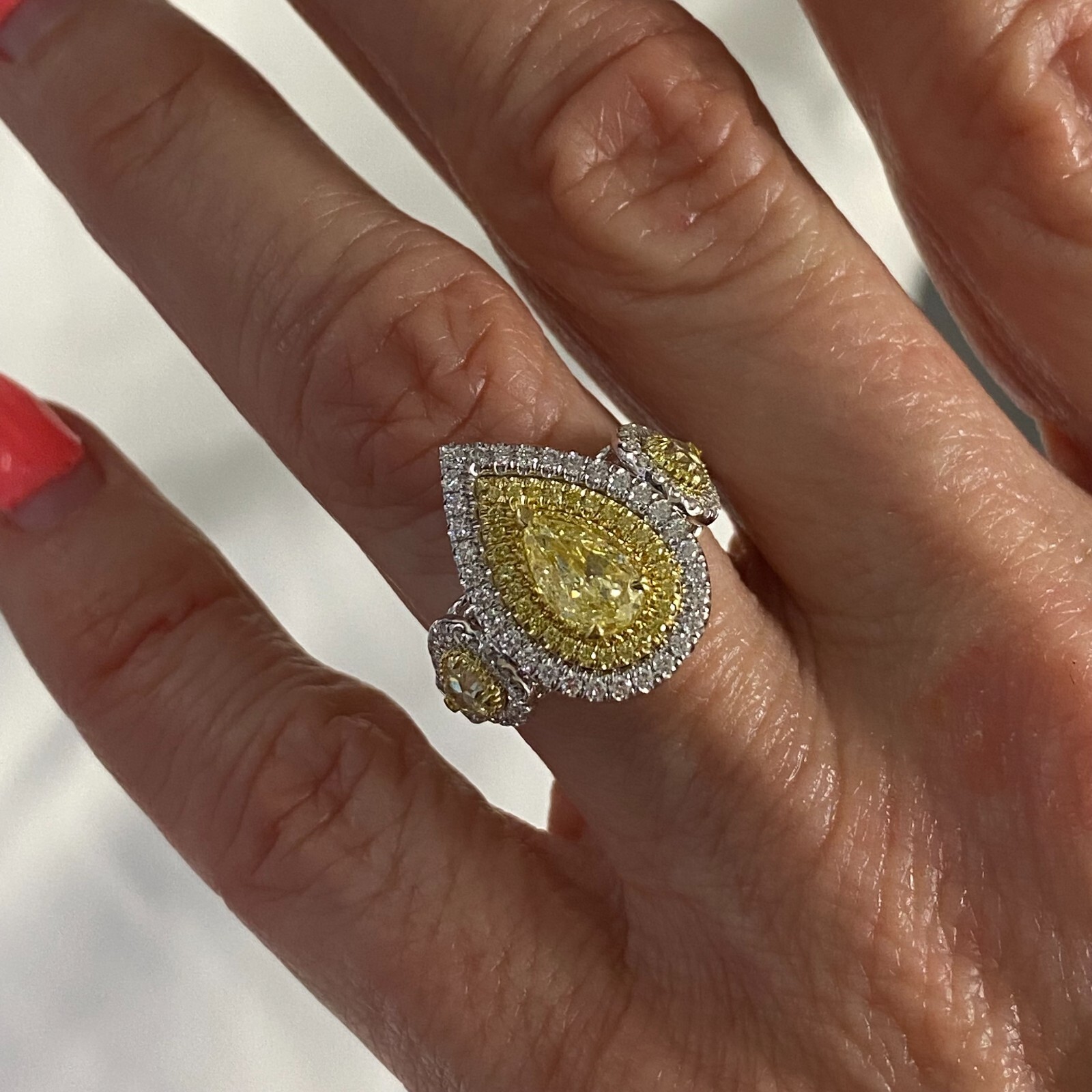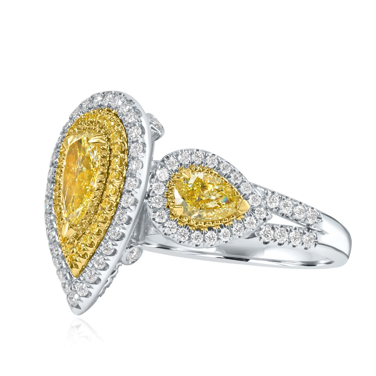 Cette belle bague dispose d'un diamant de coiffure en jaune clair et jaune de 0,71 carat GIA en son centre. Le diamant principal est entoure de deux halos - le halo interieur scintille avec des diamants jaunes, tandis que le halo exterieur presente des diamants incolores pour un contraste eblouissant. Ajout a l'attrait de cette bague se trouvent deux diamants de 0,60 carats en forme de poire de chaque cote, contribuant a son design elegant et unique. L'ensemble du chef-d'?uvre se deroule en or bicolore 18k de haute qualite, garantissant a la fois la durabilite et la beaute intemporelle. Nos produits sont tous fabriques a la main avec de la qualite et des soins, au c?ur du district de Diamond sur la 47th Street a New York. Notre devouement et notre engagement envers le travail et la qualite