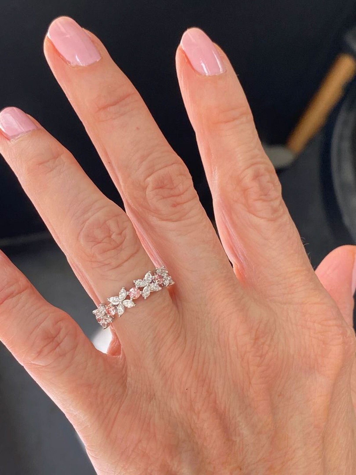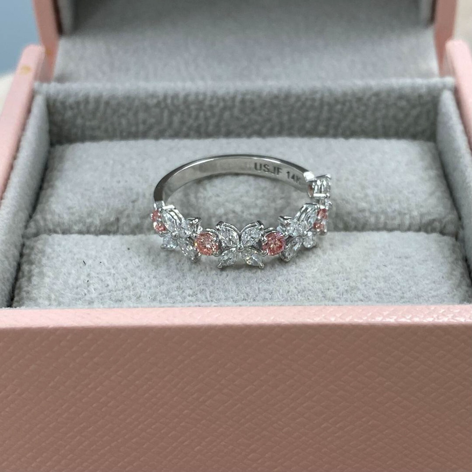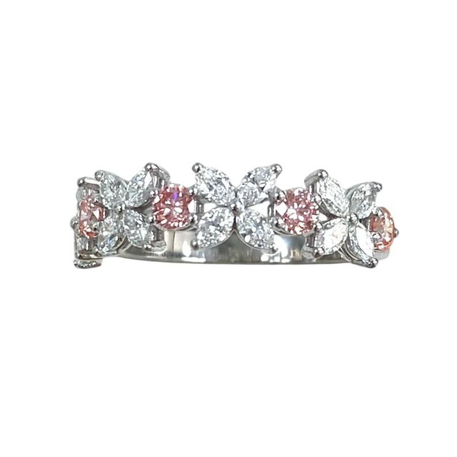 Cette elegante alliance est une celebration de la beaute intemporelle et de l'artisanat moderne. Dote de diamants cultives en laboratoire de marquise a coupe brillante disposes dans un delicat design floral a 4 petales, ce groupe cree un motif unique de 4 x qui symbolise l'unite et l'amour eternel avec des diamants roses a rose intense coupes brillantes. Le poids total des carats est de 1,00 carats.