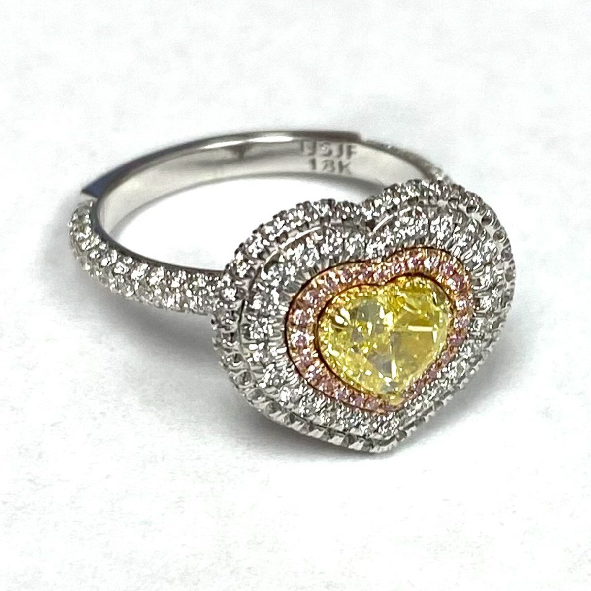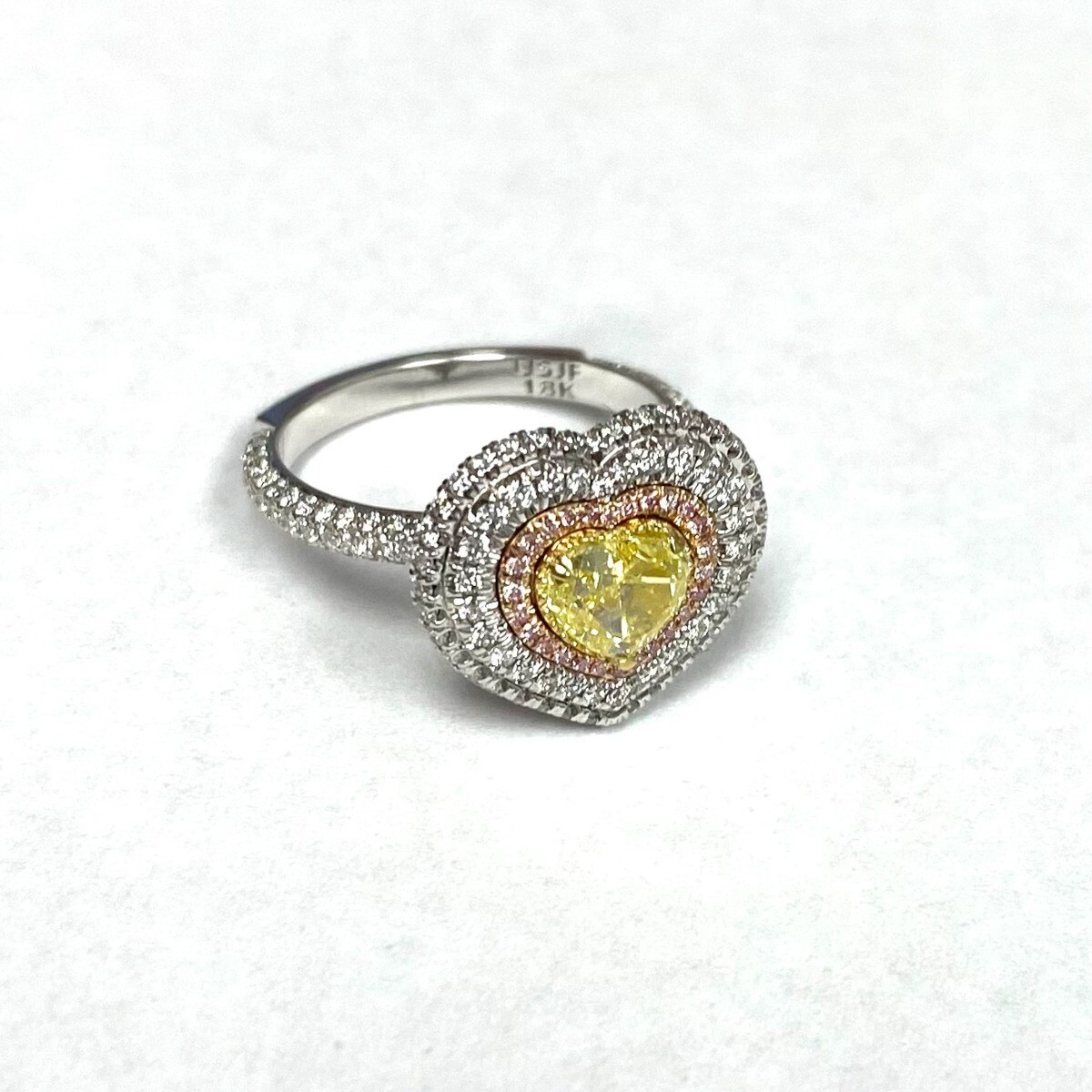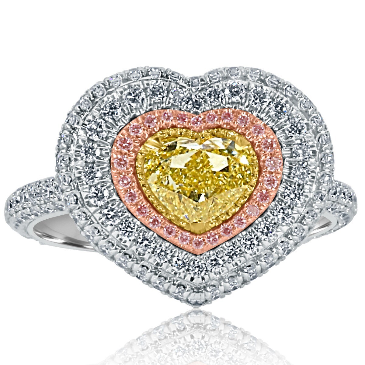 Cet anneau comprend une pierre de diamant jaune intense de 0,78 Carat Gia en forme de coeur certifie en forme de coeur avec un double halo de diamants roses et incolores coupes ronds !! Les diamants de halo sont des paves, ce qui signifie qu'ils sont places les uns des autres pour creer une bande de lumiere continue. L'anneau est fabrique en or deux tons 18 km, avec l'or jaune utilise pour le diamant en forme de c?ur et l'or incolore utilise pour les diamants de halo. Le poids total des carats est de 1,91 carats.