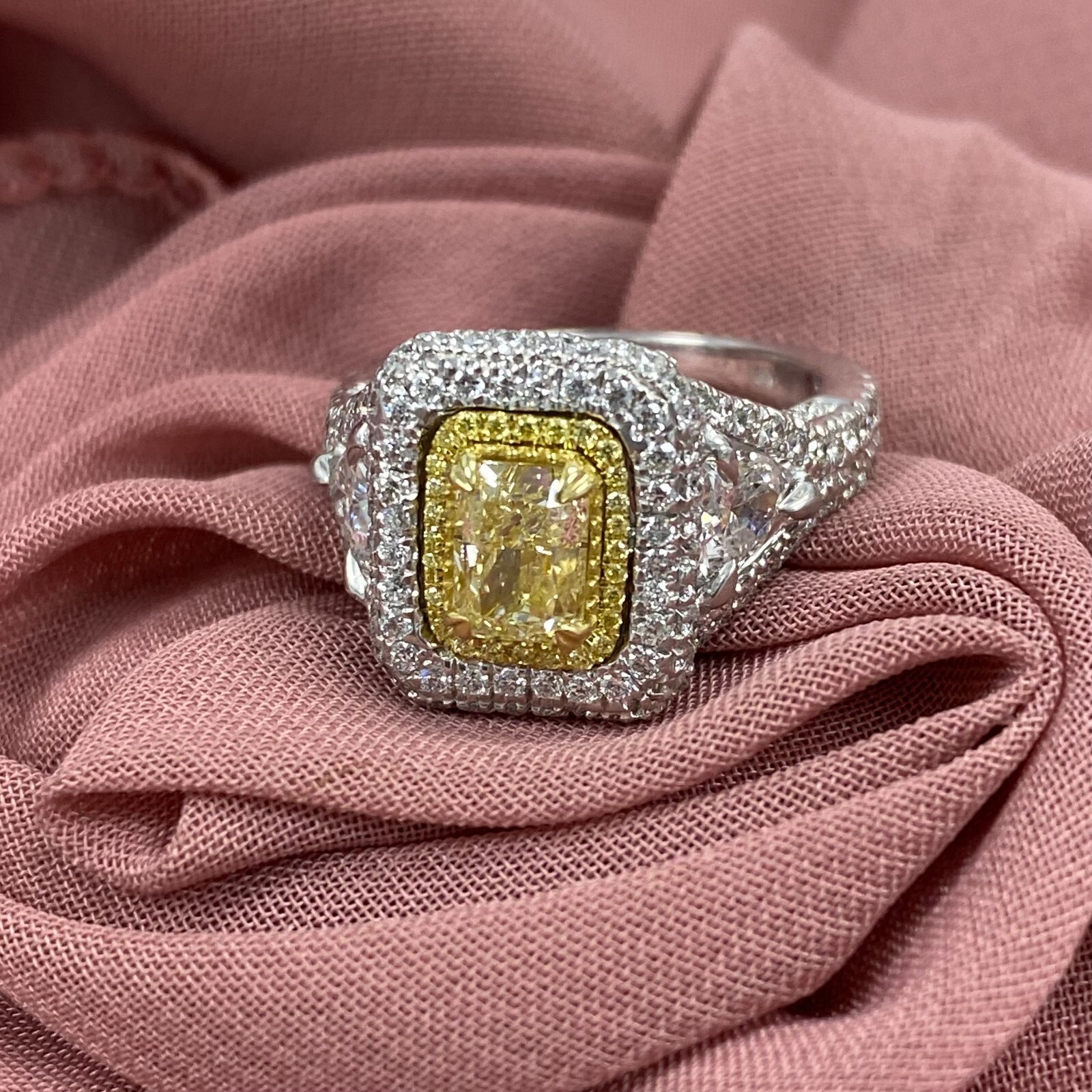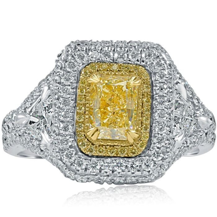 E un modo perfetto per dire - Ti amo - con questo splendido anello di diamanti. Questo anello di fidanzamento mette in mostra un centro di diamanti giallo a fantasia naturale radiante radiante da 1,00 carati a taglio naturale giallo chiaro circondato da un doppio alone di scintillanti diamanti tagli rotondi incolori e gialli. Fraticato a mano in oro bianco e giallo da 18 carati con fascia di design gambo diviso e completato con una finitura polacca elevata. Il peso totale dei carati e di 3,02 carati.