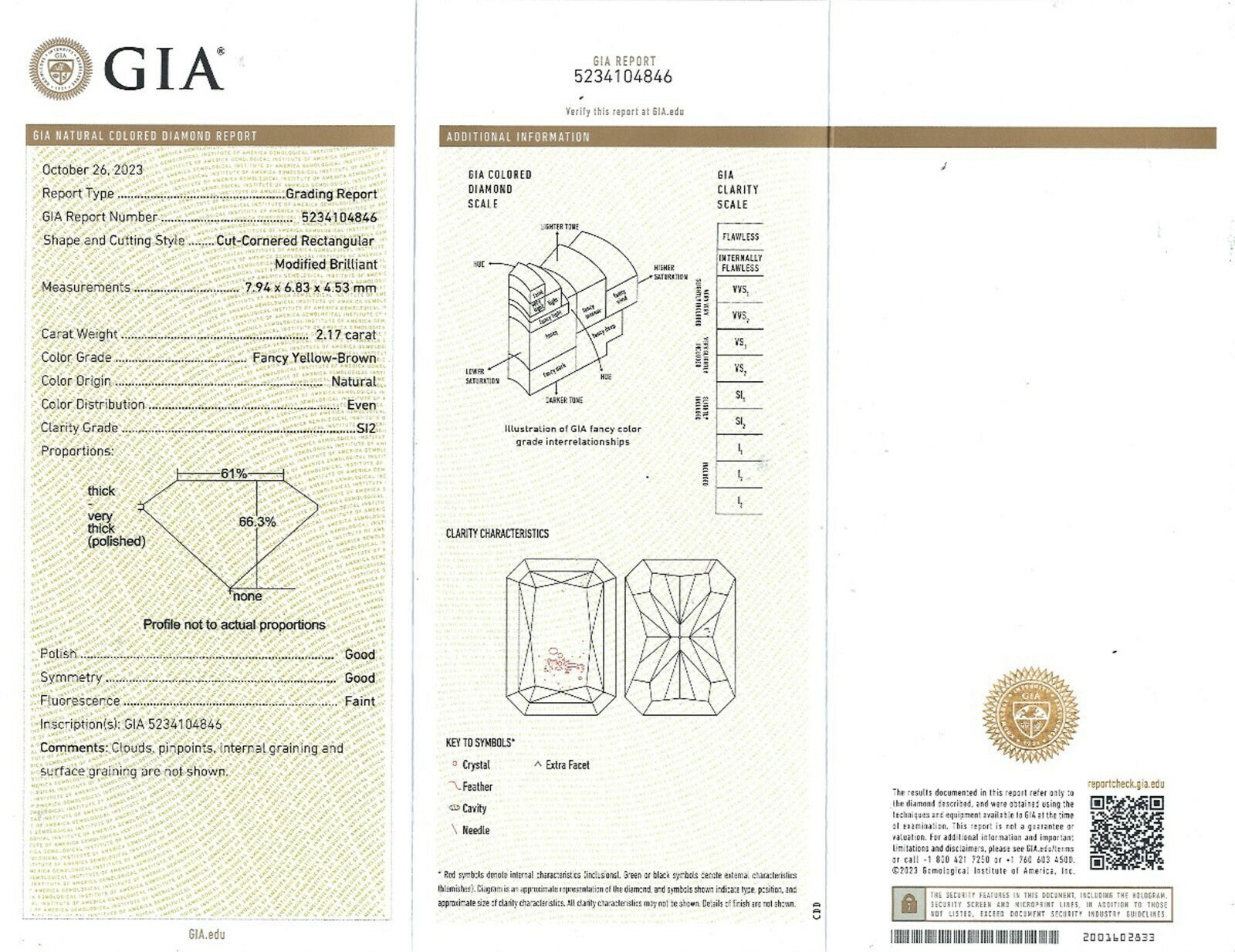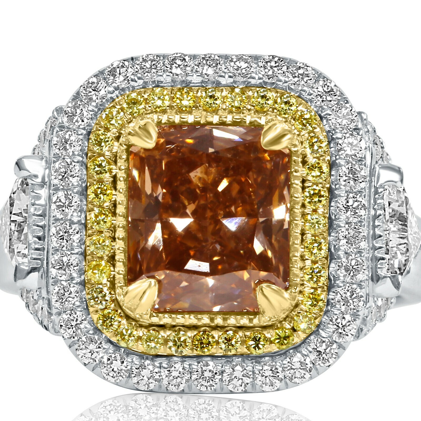 E un modo perfetto per dire - Ti amo - con questo splendido anello di diamanti! Questo anello di coinvolgimento del design art deco mostra un diamante da 2,17 carato GIA con certificato radiante taglio naturale a fantasia marrone giallo brown abbracciato da due lati di diamanti tagliati incolore trilioni. I diamanti incolori e gialli rotondi aggiuntivi allineano il doppio aono e il gambo diviso aggiungendo un'ulteriore eleganza all'anello. Realizzato a mano in oro multi-tono a 14 carati. Il peso totale dei carati e di 3,78 carati. I nostri prodotti sono tutti realizzati a mano con qualita e cura, nel cuore del Diamond District in 47th Street a New York City. La nostra dedizione e impegno per il lavoro e la qualita eccezionali superano tutti gli altri. Poiche tutti i nostri prodotti sono fa