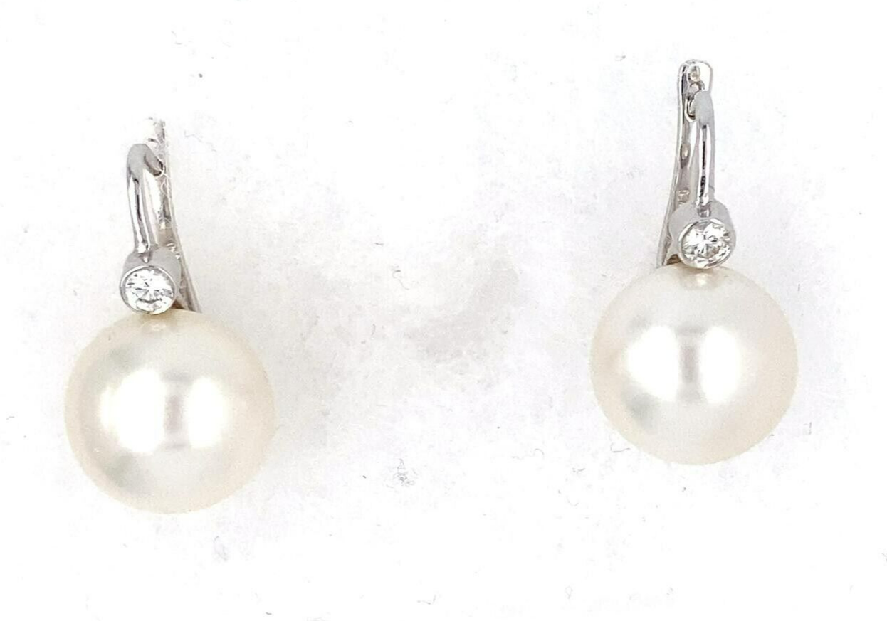 18k White Gold K.R. 13mm Cultured Pearl and Diamond Drop Earrings 10.2g