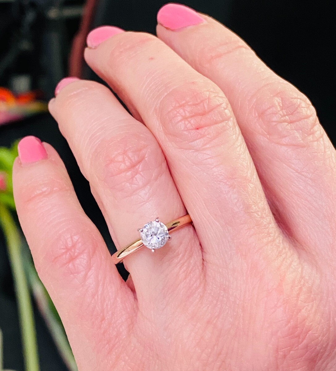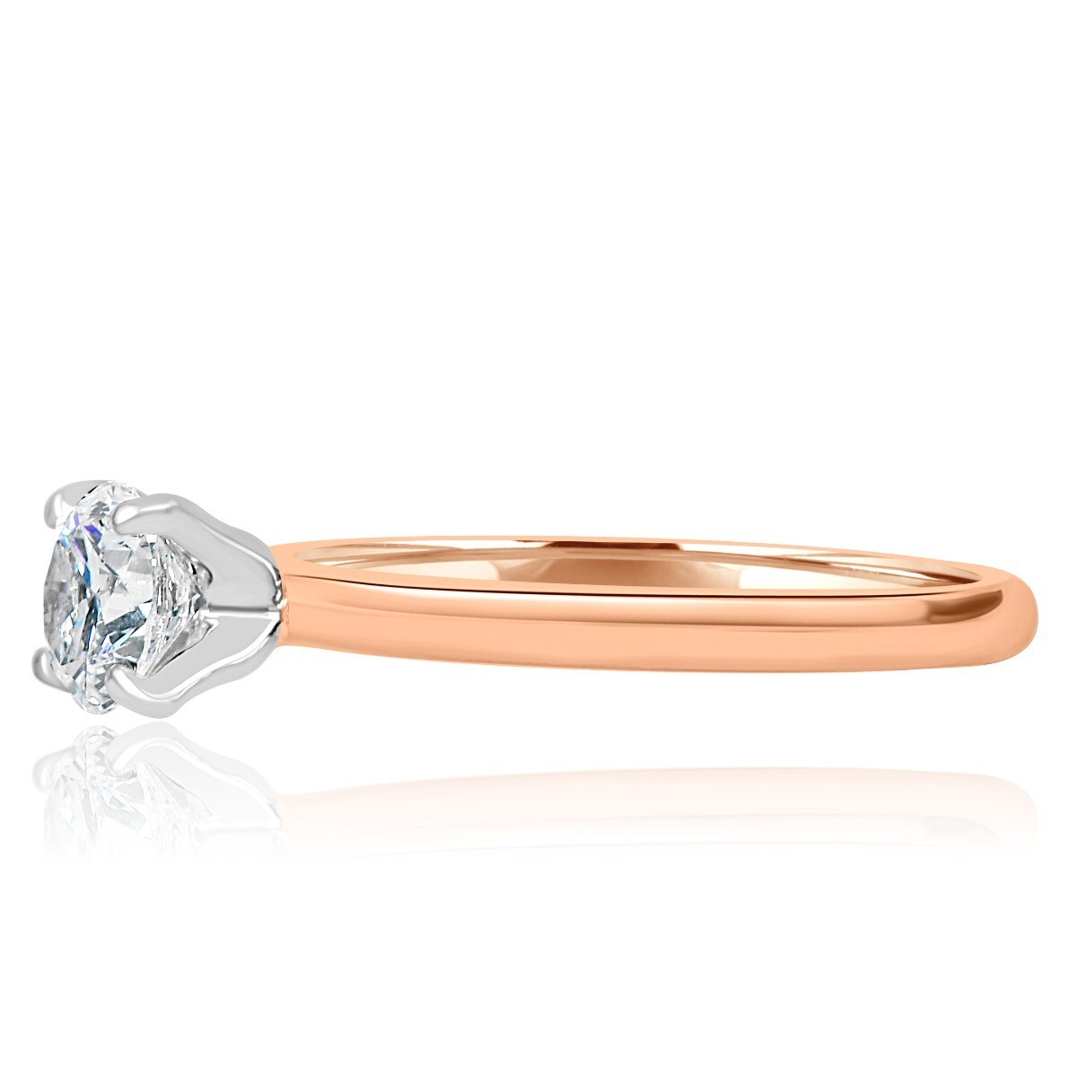 Dieser schone Solitaire Diamond Engagement Ring ist eine klassische Wahl, die niemals aus der Mode kommt. Der Ring verfügt über einen GIA-zertifizierten 0,70-Karat-Round-Diamanten in vierzahlener 14-Karg-Weißgold. Die Band ist in 14 Karat Rosegold handgefertigt und mit einem hohen polnischen Finish abgeschlossen.