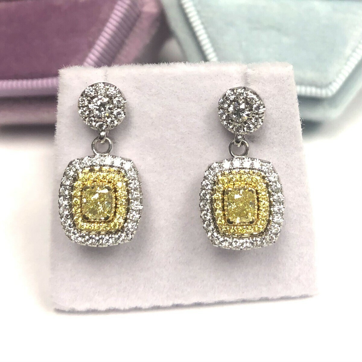 Diese Ohrringe handelt in 14 Karat zweifarbigem Gold und verfügen über 0,62 Karat -Kissen brillanten Schnitt natürlichen, gelben Diamanten im doppelten Halo von 1,00 Karat (0,18 ct - gelb und 0,82 ct - f -farblosen runden Schnitt-) Diamanten in der Pave -Einstellung, die durch runde farbenfrohe Diamanten geschnitten wurden. Das Gesamtkarat -Gewicht betragt 1,62 Karat. Diese atemberaubenden Teardrop -Diamantohrringe sind perfekt für Ihren Hochzeitstag oder Ihren besonderen Anlass !!