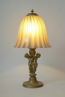 Absolute unique from our lighting manufacturer - table lamp "Golden Angel". Second copy selectable! Massive -measuring gear with nice decorations and two putti, great patina. 50 cm, umbrella diameter approx. 25 cm. Completely renewed electrical installation.pvc supply with an additional cord intermediate switch. New "Edison" E27 version with pull chain switch, up to max. 60 watts - we recommend urgent LED lamps! Small parts such as screws or washers have been renewed.