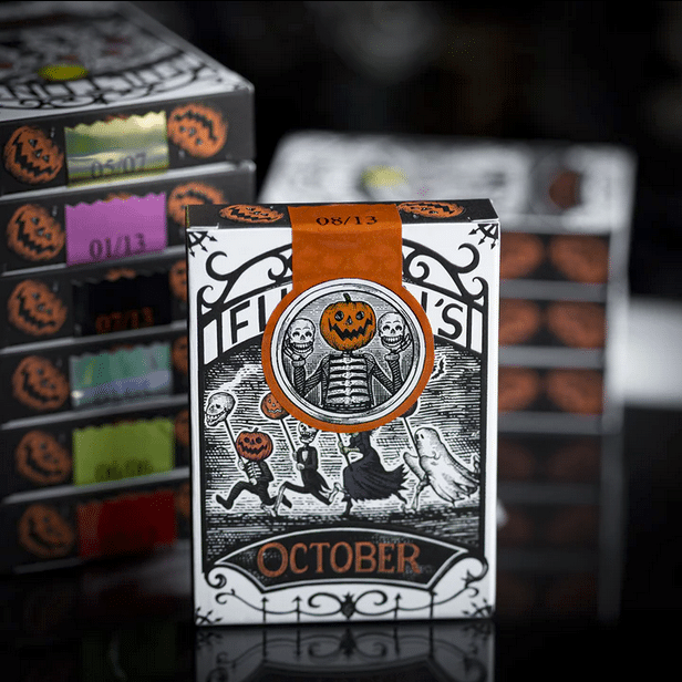 This first edition of October V2 features a striking black-bordered card back featuring our favorite Jack-O-Lantern prominently displayed holding his old friends. Every number and letter on the number cards was hand illustrated by Noble using a bone-like new Fulton Font. This is the best the October Universe has ever looked.