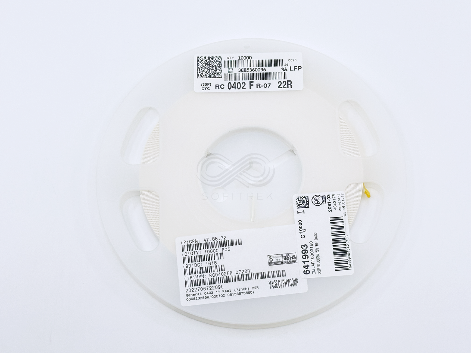 New Full Reel of 10,000 Pieces - RC0402FR-0722RL YAGEO 22 Ohm 1% 1/16W 0402 SMD Thick Film Chip Resistor