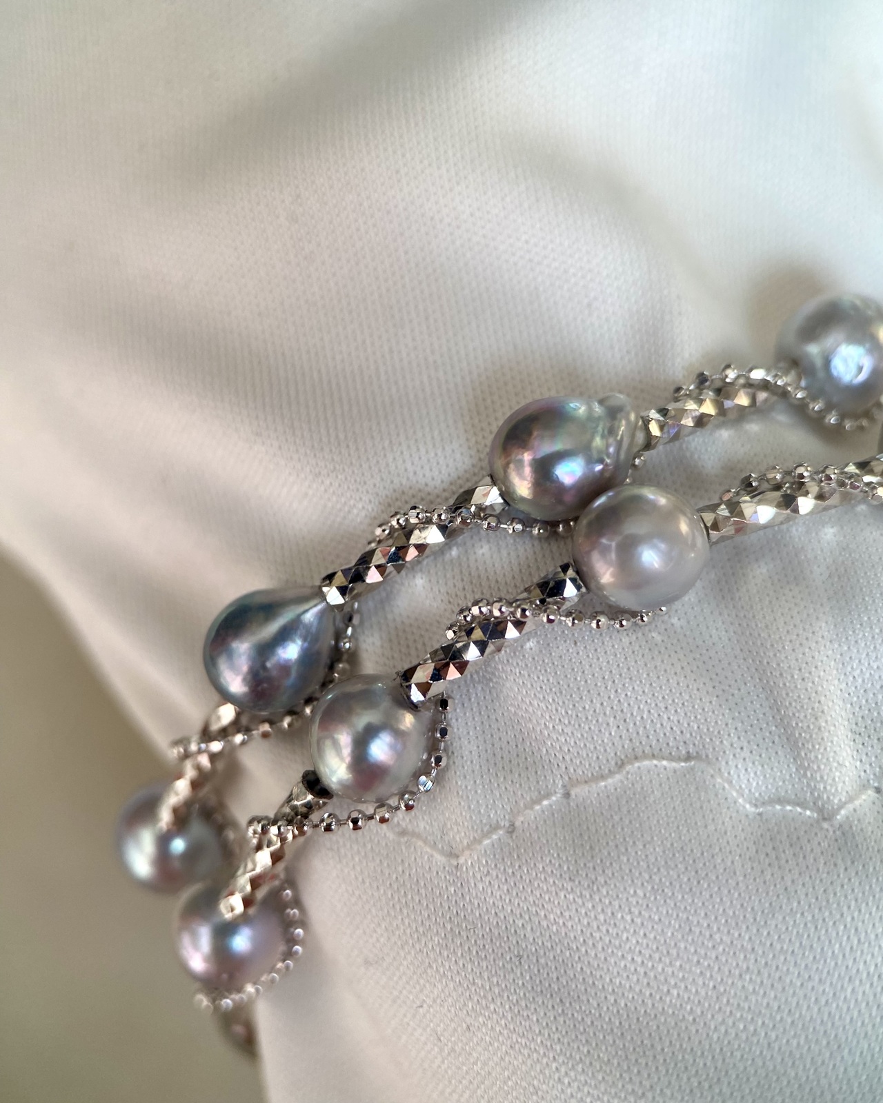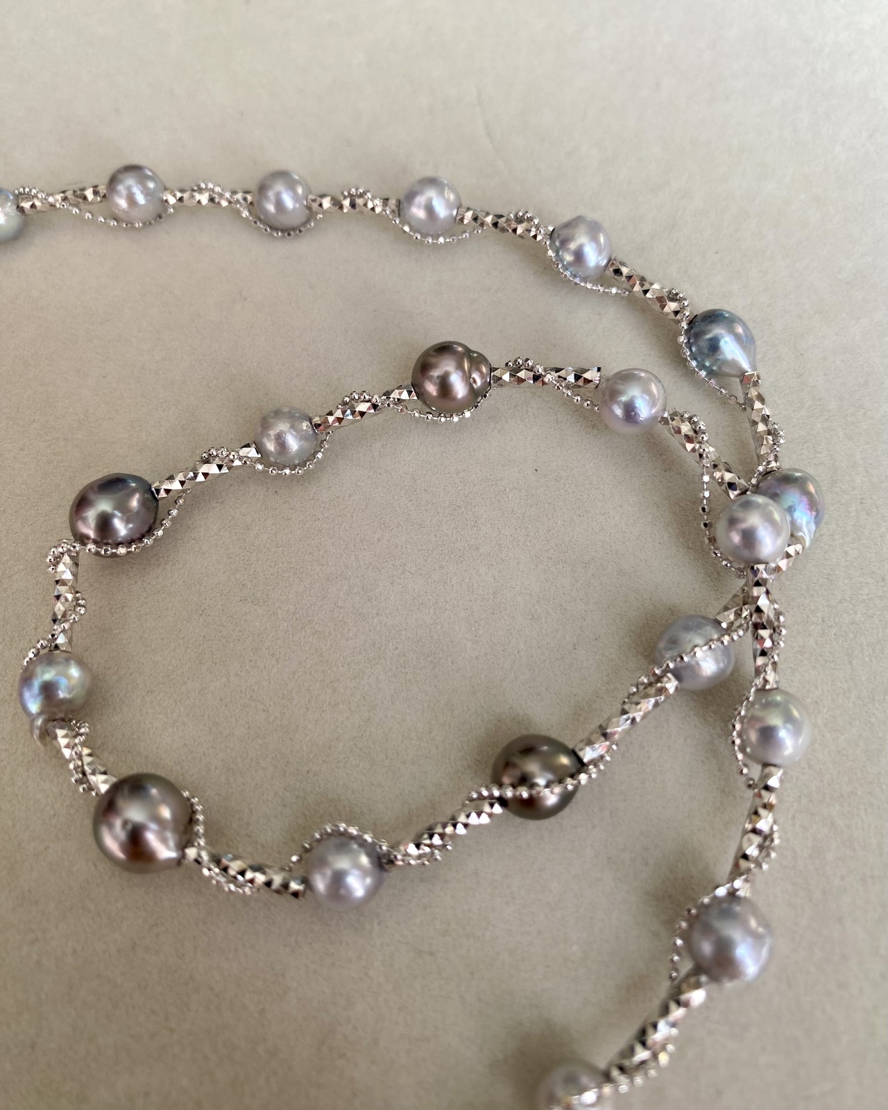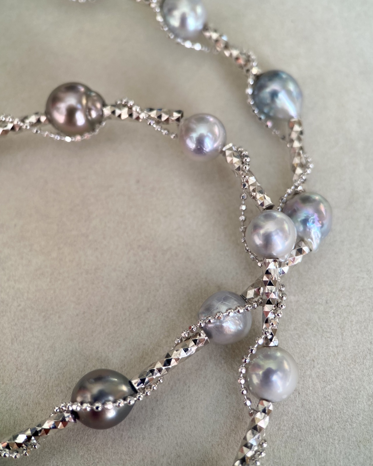 The pearls comprise luminous Japanese silver-grey-blue Madama Akoya baroque pearls, accented with deeper-toned Tahitian South Sea baroque pearls. Together, they form a striking harmony of cool and warm hues. The Madama pearls display their signature clarity and radiant silver-blue lustre, adorned with vivid iridescent overtones—fresh, dreamy, and elegant—while the darker Tahitian pearls introduce depth through their distinctive black-purple metallic sheen. Though each pearl varies slightly in form, the arrangement achieves a natural rhythm and balance, blending individuality with visual symmetry.