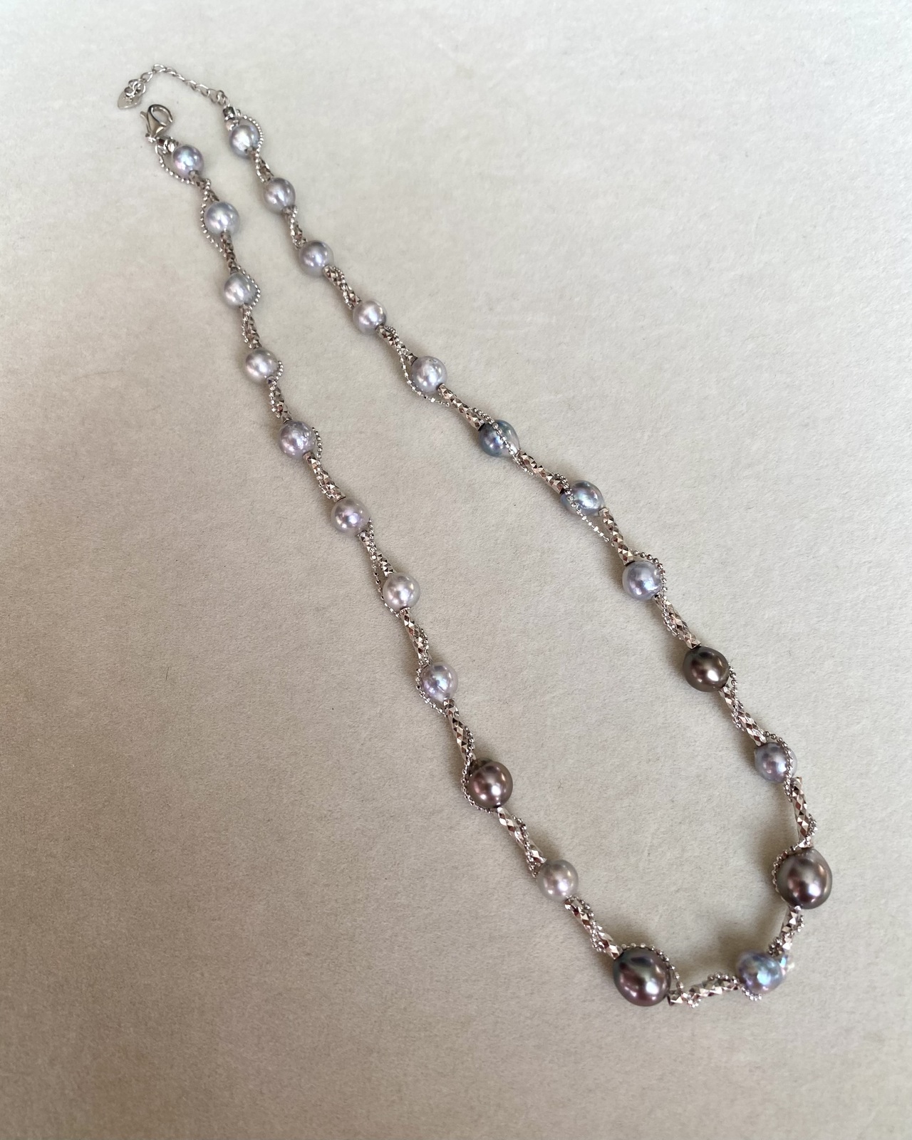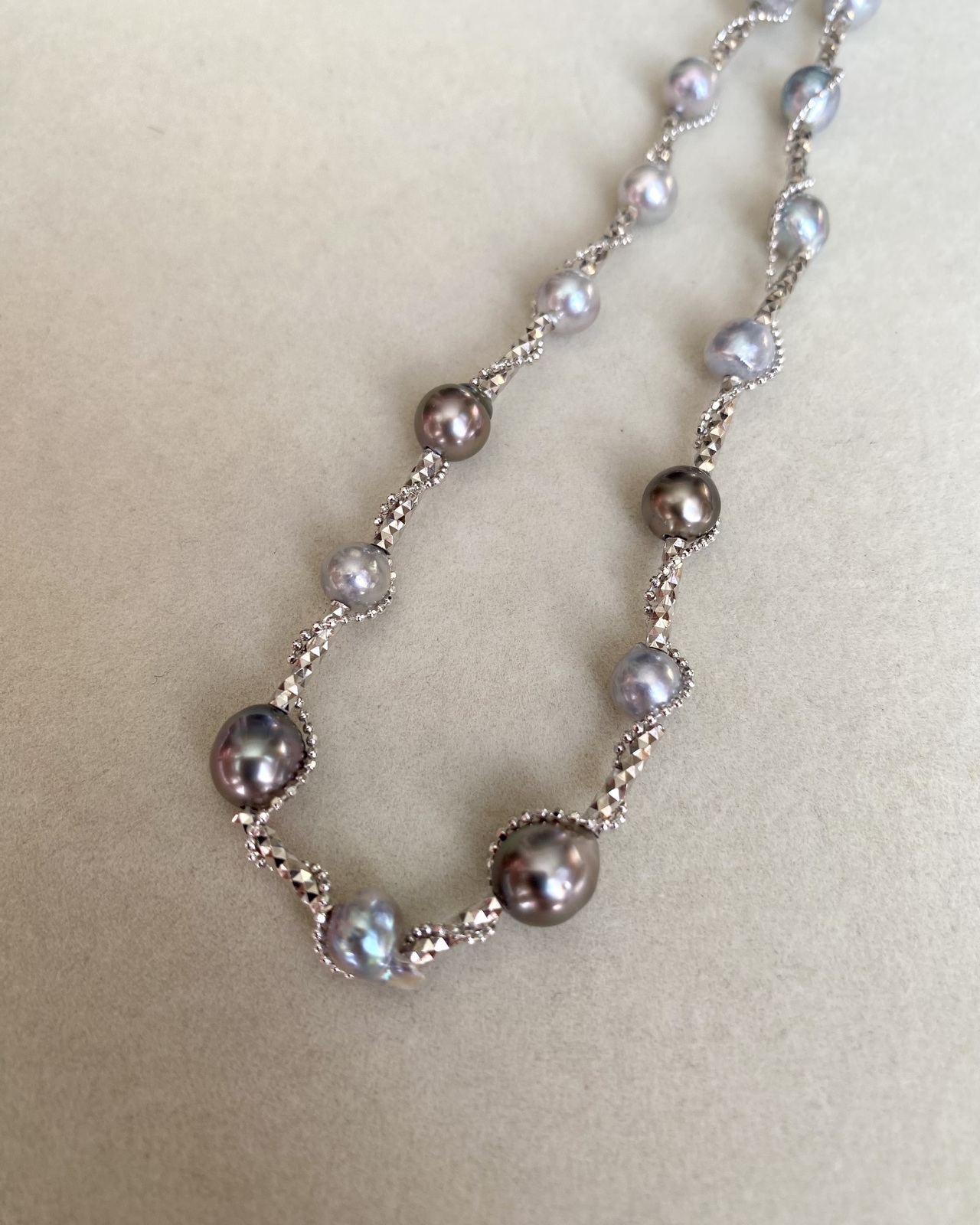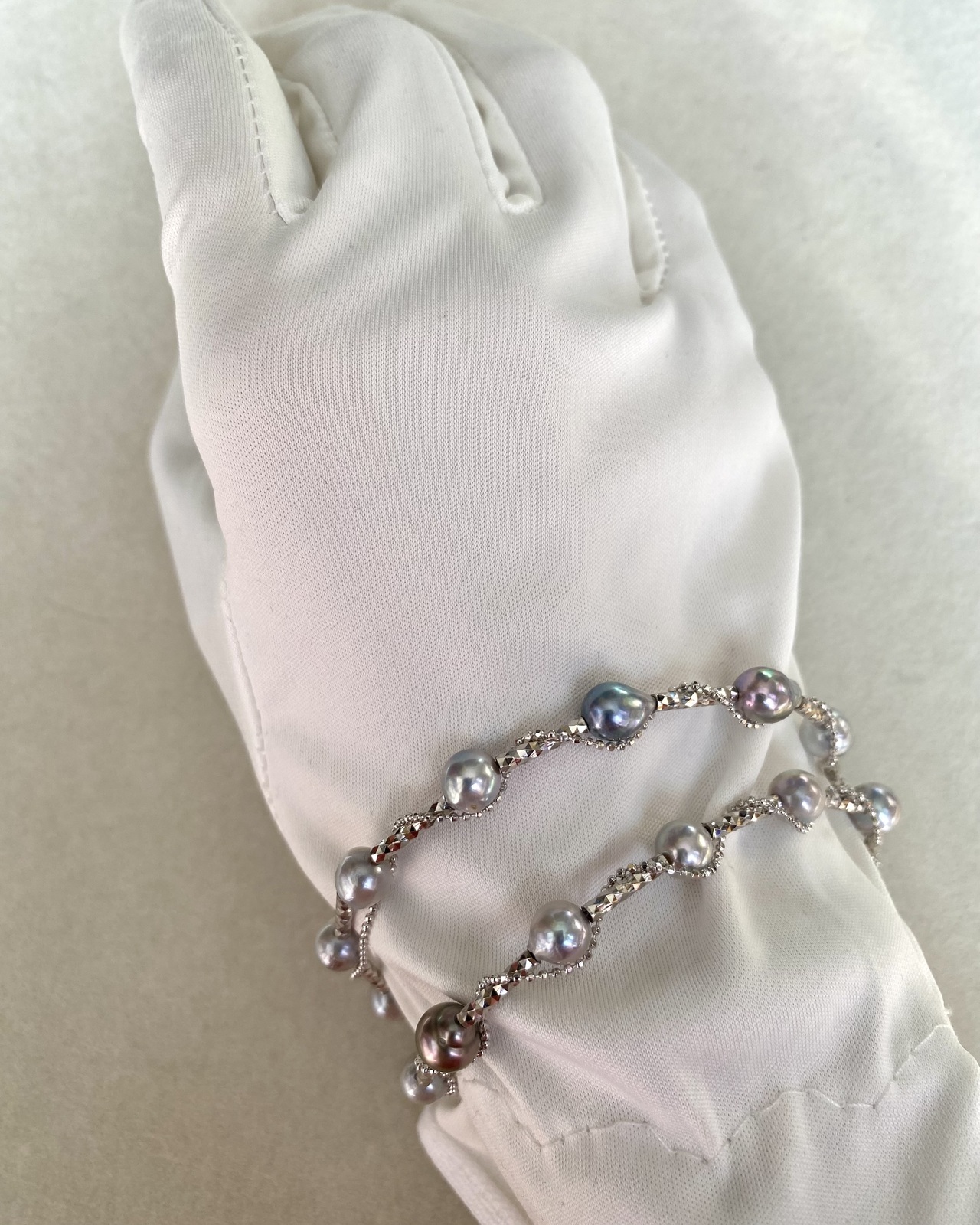 The pearls comprise luminous Japanese silver-grey-blue Madama Akoya baroque pearls, accented with deeper-toned Tahitian South Sea baroque pearls. Together, they form a striking harmony of cool and warm hues. The Madama pearls display their signature clarity and radiant silver-blue lustre, adorned with vivid iridescent overtones—fresh, dreamy, and elegant—while the darker Tahitian pearls introduce depth through their distinctive black-purple metallic sheen. Though each pearl varies slightly in form, the arrangement achieves a natural rhythm and balance, blending individuality with visual symmetry.