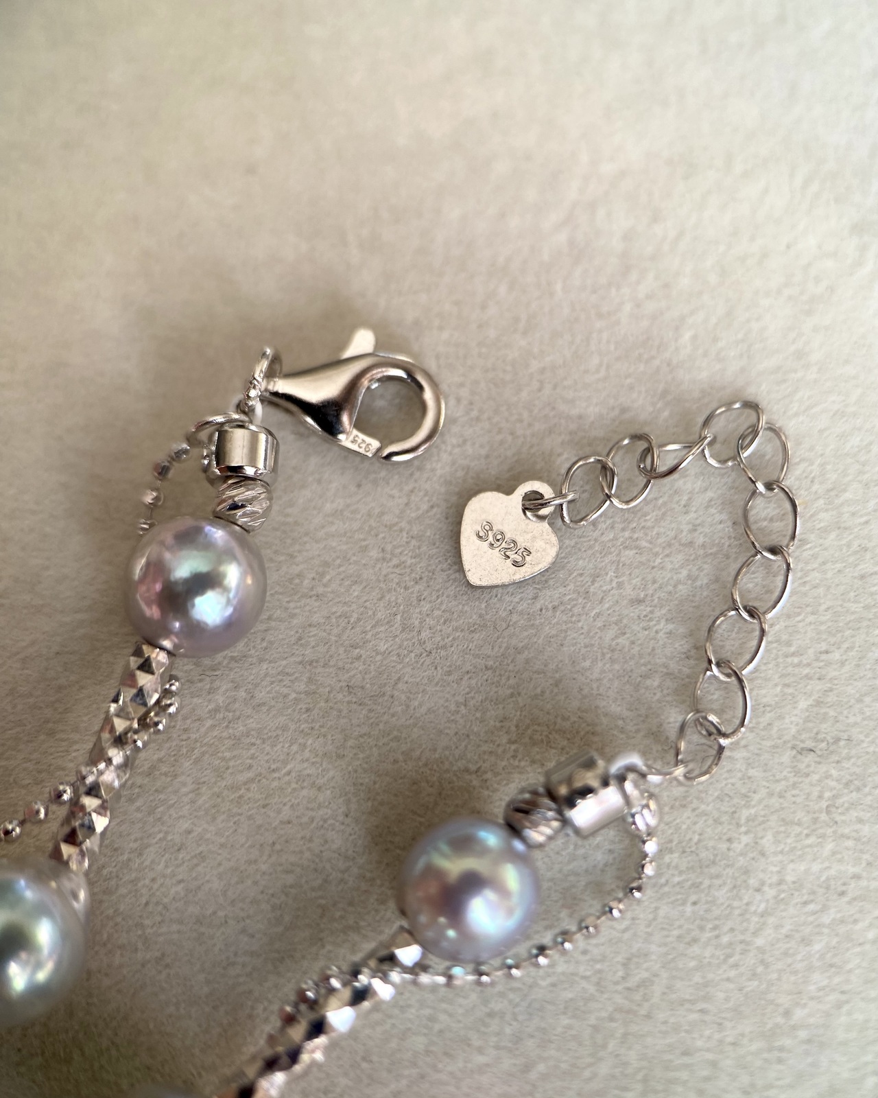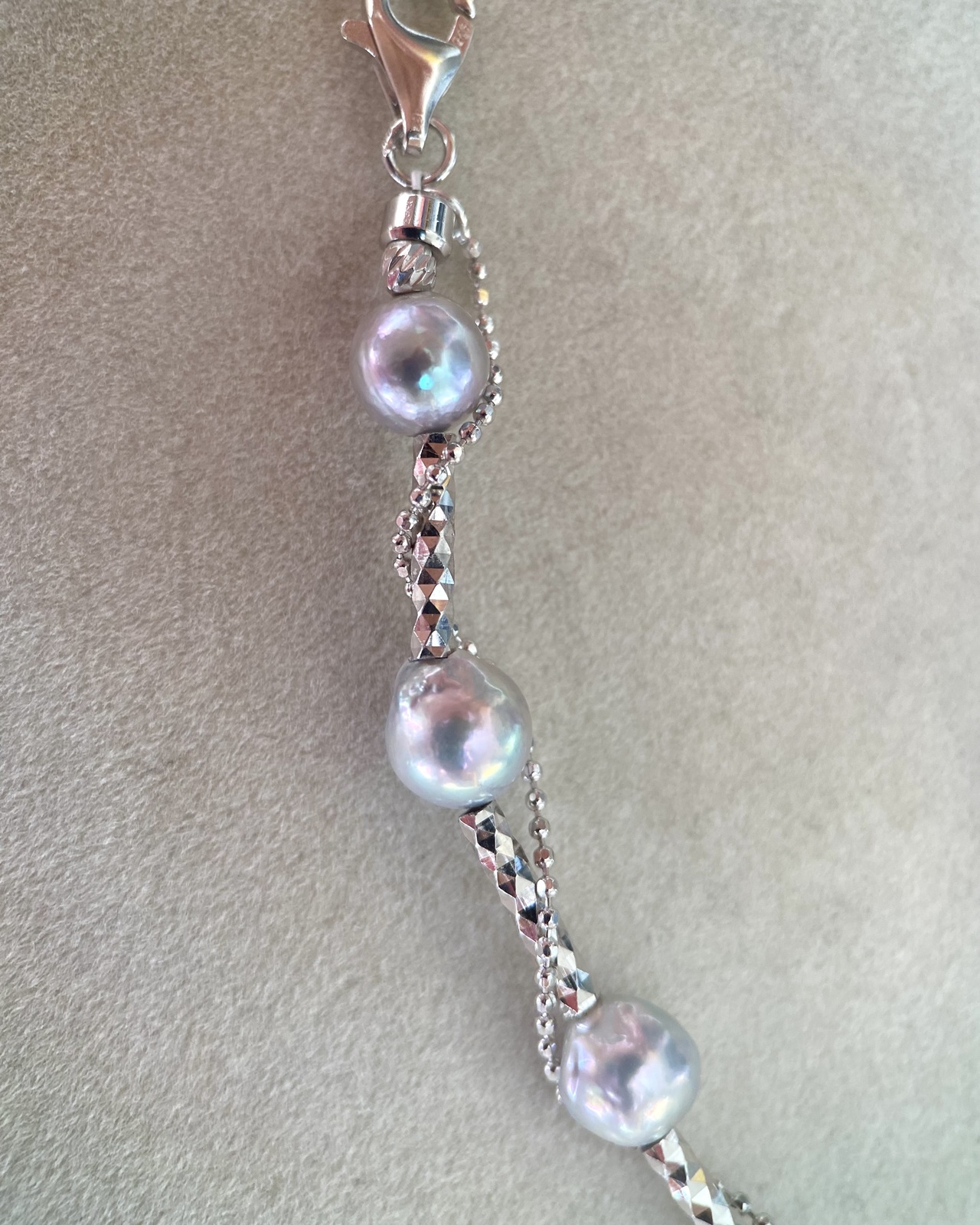 The design draws inspiration from the “flow of light and shadow,” as the silver lines intertwine with the pearls to create gentle wave-like contours—reminiscent of moonlight rippling across the sea. When worn, it rests beautifully along the neckline, radiating a soft yet modern brilliance. The necklace can also be elegantly wrapped twice around the wrist to transform into a graceful bracelet. In this form, the intricate reflections of silver and pearls intertwine closely, creating a layered, fluid sparkle that captures the essence of quiet sophistication.