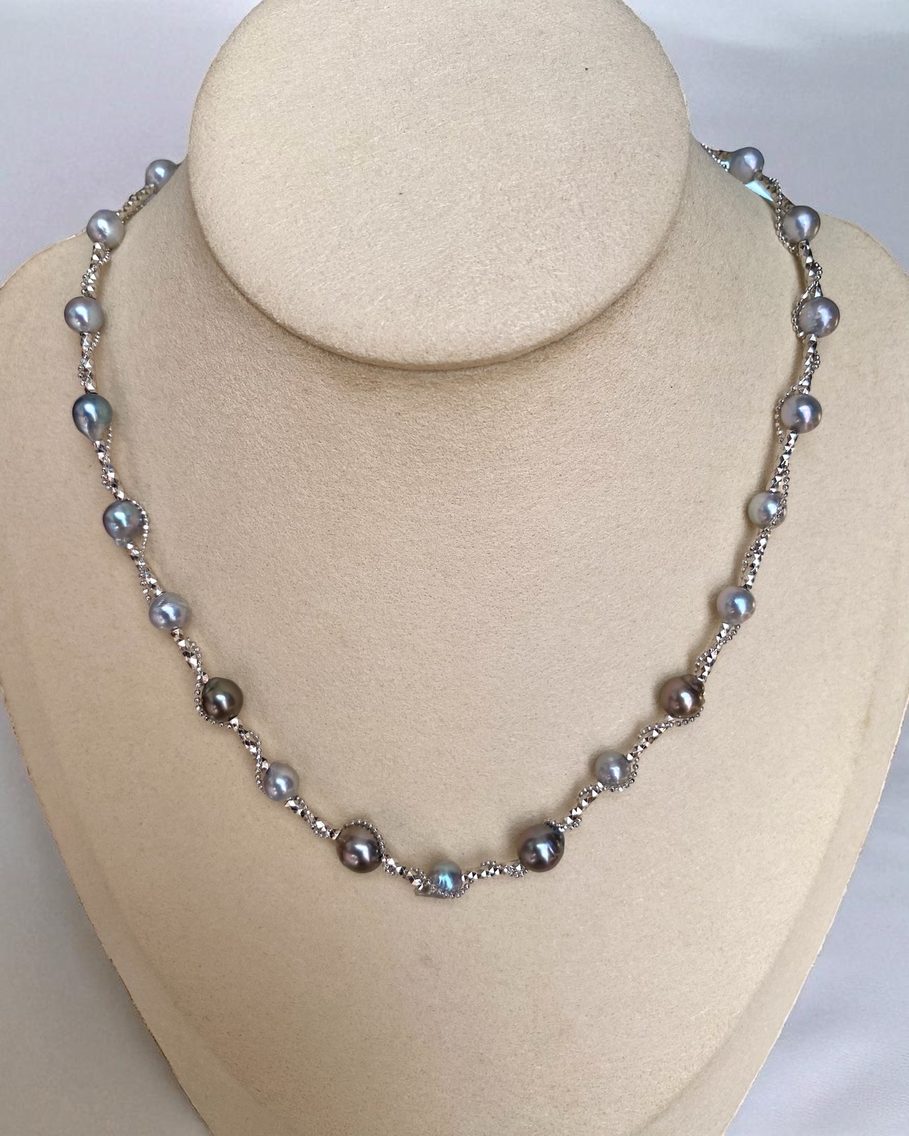 This necklace showcases exceptional craftsmanship and refined design, fully Japanese-made and sourced directly from the Japan International Jewellery Exhibition. The overall composition balances modern sophistication with organic softness, combining pearls and silver in a gracefully architectural structure that highlights fluidity and dimension.