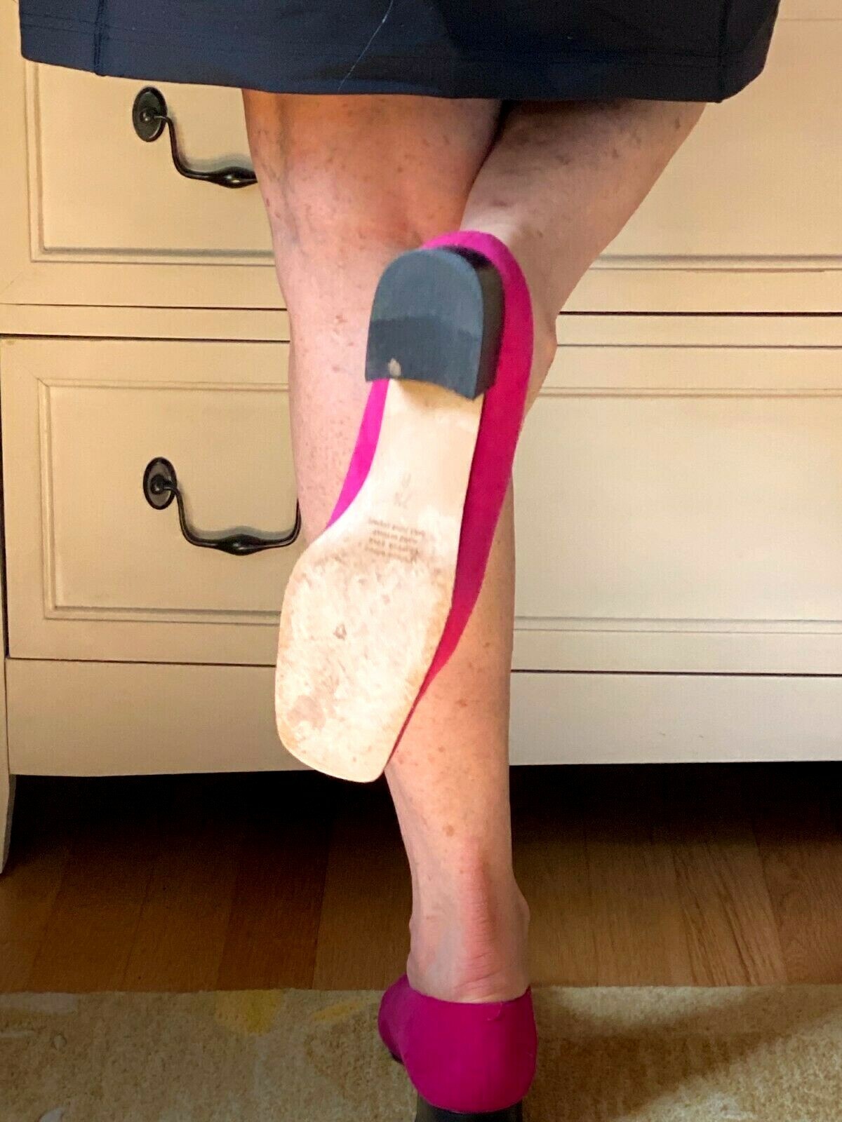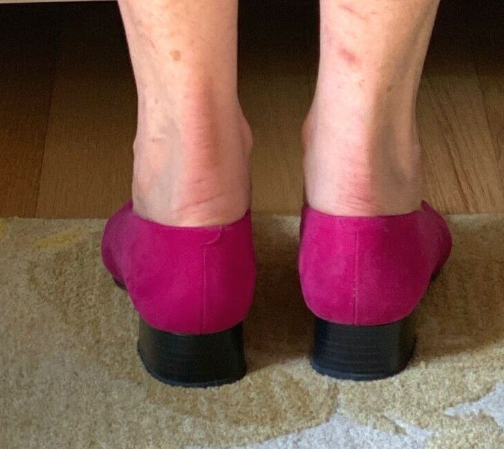 Like new, barely worn, kept wrapped in original box, square toe low heel pumps with suede flower on the vamp. Leather soles.
