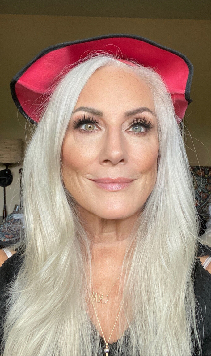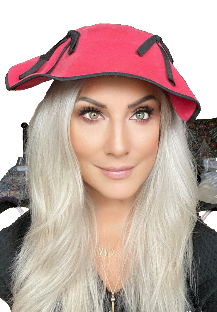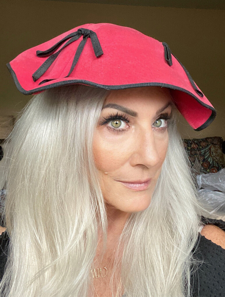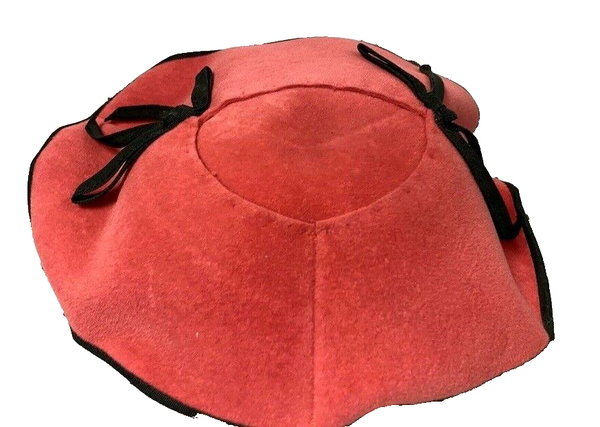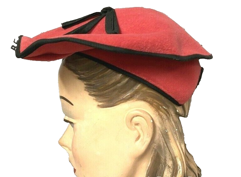 Pretty vintage "Sheila" designer ladies hat, from the 1950s, in a pinky-red, with black piping and bows, with a cool twist in the front. The style will fit almost any head. and the cap should be bobby-pinned on- I wear a 23" and I can wear it. Beautifully made! It measures about 11" across the top.