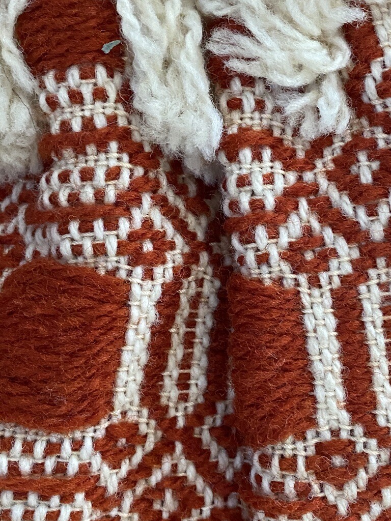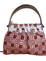 Nice vintage bag with curved wooden handles, and a hand woven jacquard body in rust and beige. It measures 9" x 12", and that's not including the handles. Excellent clean condition.