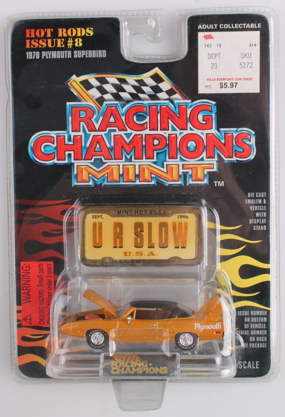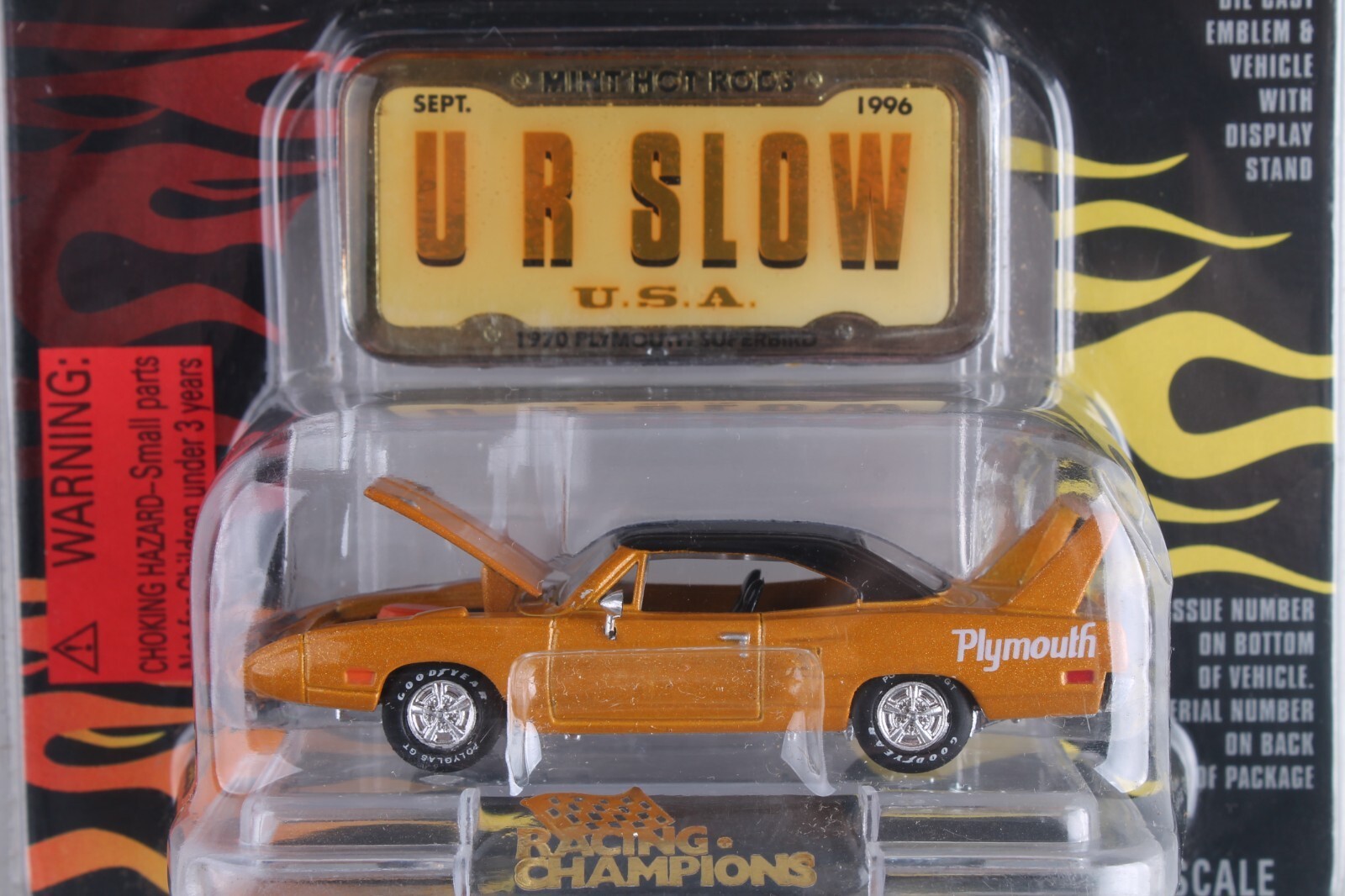 This Racing Champions Mint diecast model of the 1970 Plymouth Superbird is a must-have for any collector or fan of classic cars. With its metallic gold finish and 1:68 scale, this model is a stunning representation of the iconic vehicle. The opening hood and included display stand make it perfect for showcasing in any collection. In addition to its great looks, this diecast model also comes with some unique features such as issue #8, rubber tires, and a diecast emblem that reads "U R SLOW". This model is recommended for ages 8 and up and is a great addition to any collection of contemporary manufactured cars, trucks, and vans.