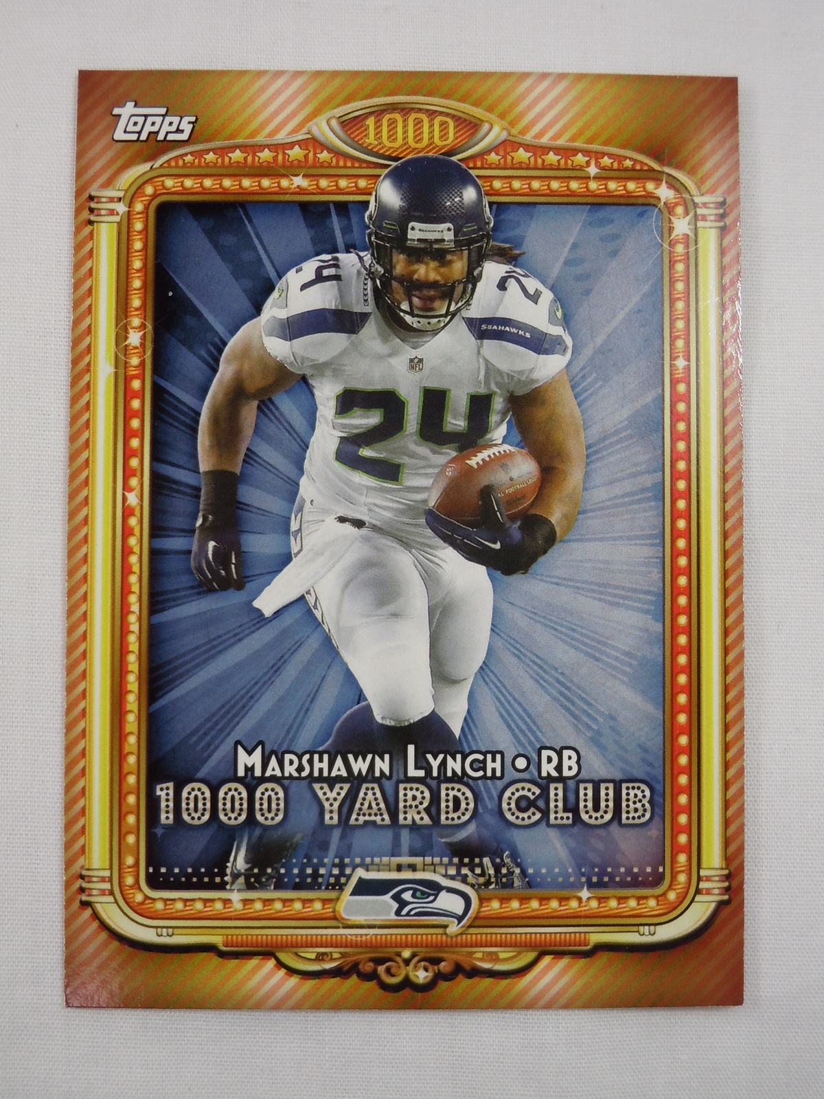 This is a nice example of a 2013 Topps #5 Marshawn Lynch 1000 Yard Club.Other important information about this card: In 2013 Marshawn Lynch played for the Seattle Seahawks.Please check out our other listings for more great cards.
