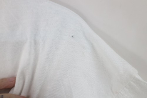 Stains front top left/left shoulder. Dark spots back. Collar, arms discolored. Yellowed. Pilling. Graphics cracking/faded. Loose threads collar