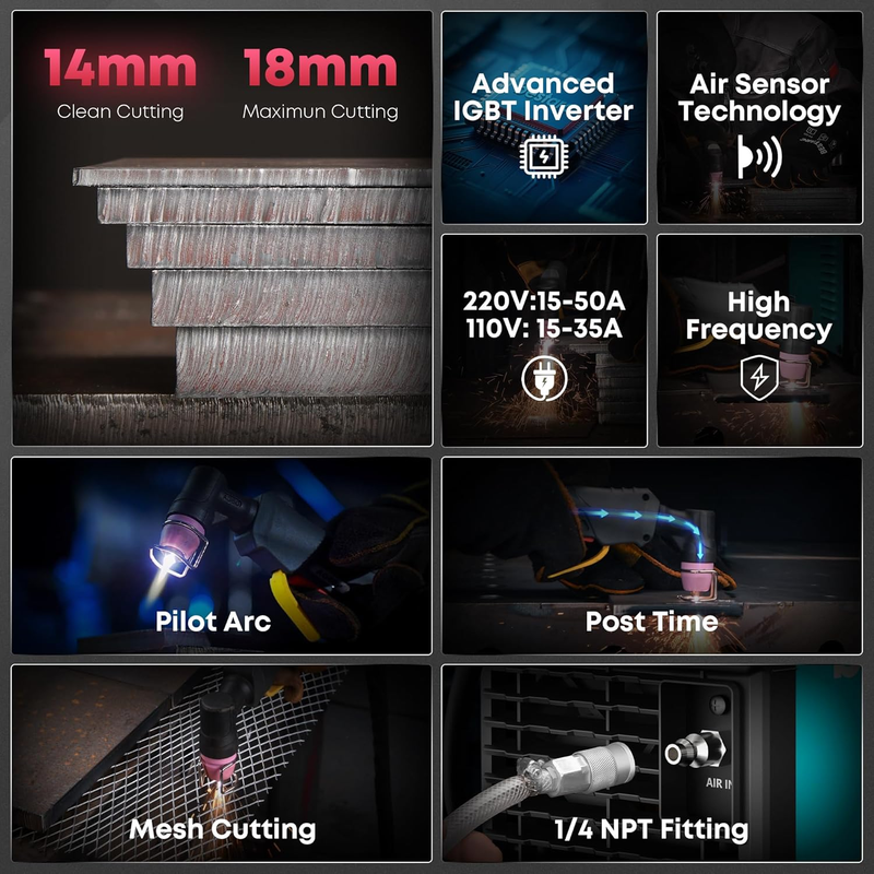 [Powerful Cutting Ability] Dual voltage 110/220V good for home, workshop and hardware shop use. Professional performance 1/2?? clean cuts on Iron, Steel aluminum and copper with Inverter IGBT Technology. Very powerful for DIY and heavy duty project. The Maximum cutting thickness is recommended to 12mm@35A 110V 50PSI; 18mm@50A 220V 65PSI. Dry and compressed air is required. Power breaker up to 40A@110V 35A; Up to 30A@220V 50A.