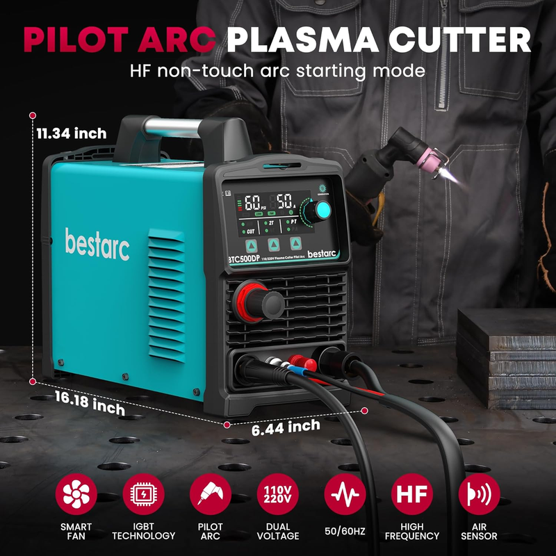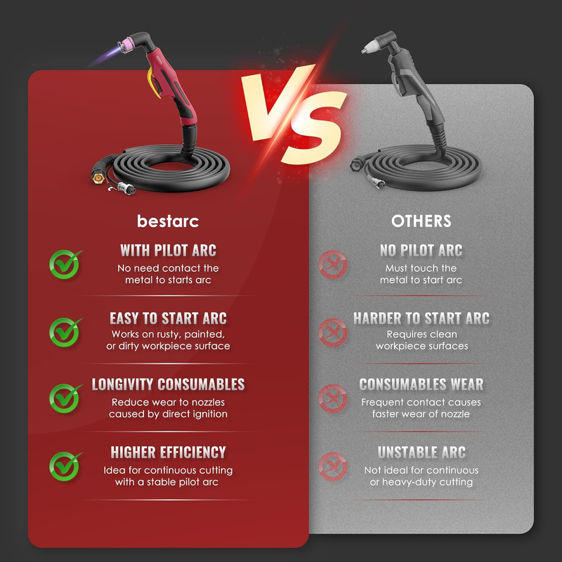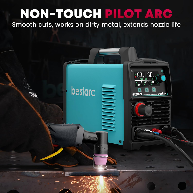 [Pilot Arc]: bestarc plasma cutter with the pilot arc function. It is a high-frequency non-touch arc starting mode. The torch head does not need to touch the metal plate, making it effective on rusted, painted, or dirty metal surfaces. Adjustable PA function for extended pilot arc duration, reduced energy consumption in non-cutting work, reduced electrode burning, and extended consumables cutting life.