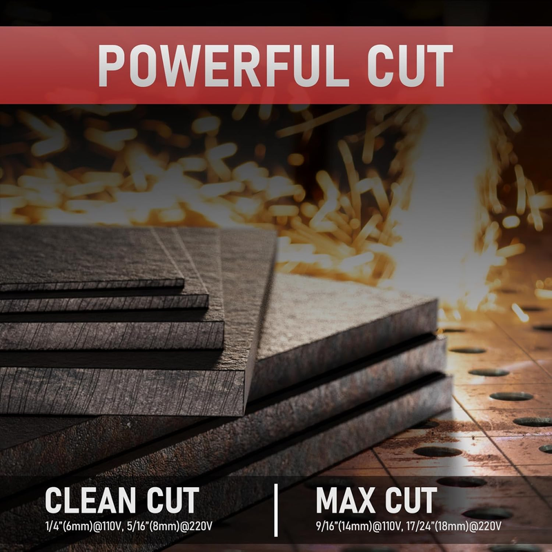 POWERFUL CUTTING CAPACITY: : Featuring a substantial 55A high current for maximum power, it delivers deeper cutting thickness. Ideal Clean Cut: 1/4"(6mm)@110V, 5/16"(8mm)@220V, Maximum Cut: 9/16"(14mm)@110V, 17/24"(18mm)@220V. Powered by international leading MCU intelligent digital control technology, it ensures deep, precise, and clean results every time.