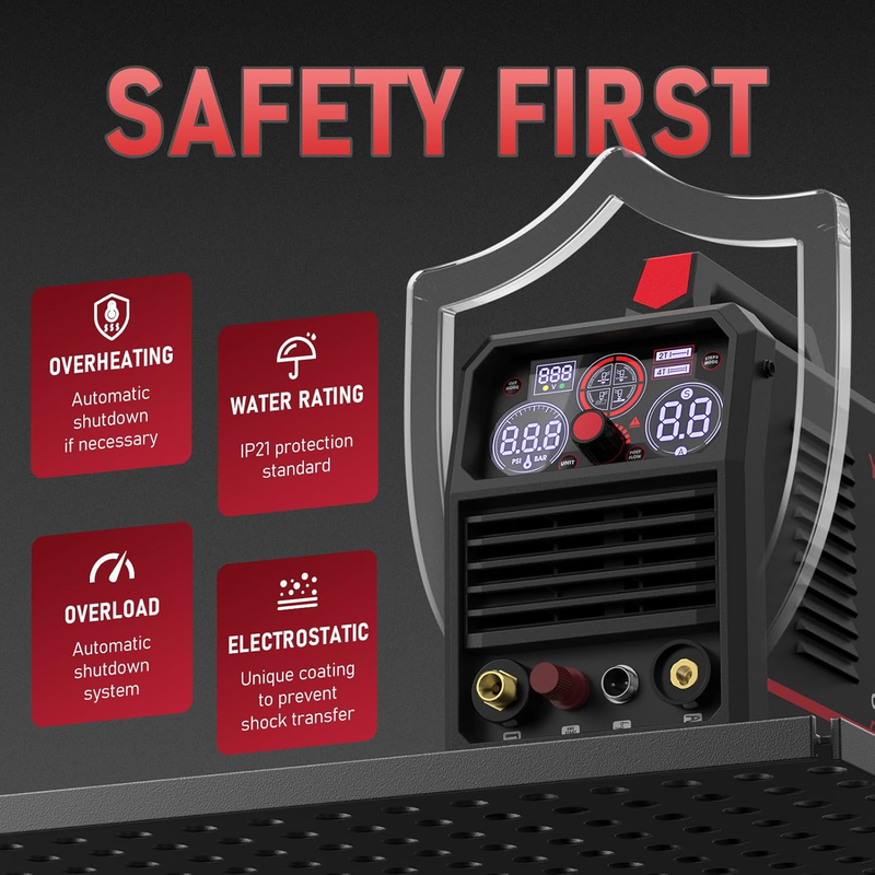 DIGITAL DISPLAY: The latest digital display centrally shows parameters such as air pressure, voltage, current, etc., allowing users to view the status of the equipment in real time, adjusting the operation in a timely manner, and improving the efficiency of the operation. There will be an error code system on the screen if there is a problem with the machine.