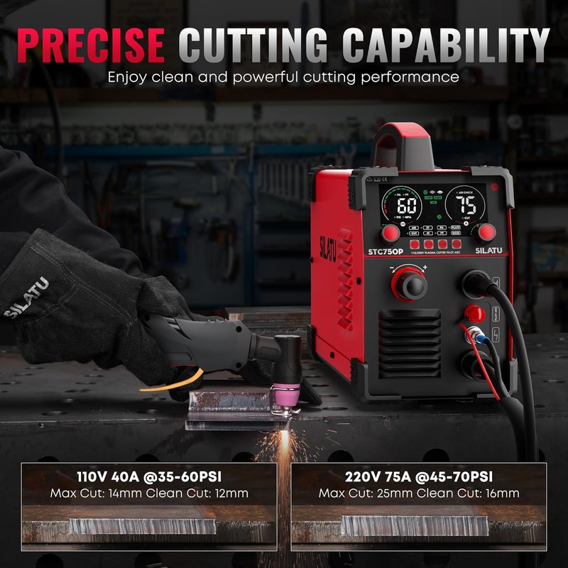 Plasma Cutting Thickness: The plasma cutting equipment with advanced IGBT inverter technology, the 50/60 Hz high-frequency pilot arc plasma cutter supports dual voltage inputs of 110V and 220V, and operates at 60% duty cycle. The 110V current range is 15-40A, which is suitable for home and workshop use. The 220V current range is 15-70A, which is suitable for DIY projects and heavy-duty tasks. The recommended maximum cutting thickness is 14mm at 40A and 45 PSI on 110V, And 25mm at 75A and 70 PSI on 220V