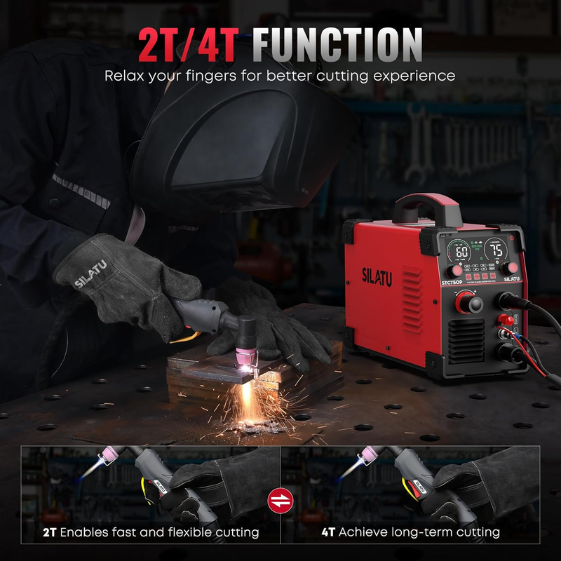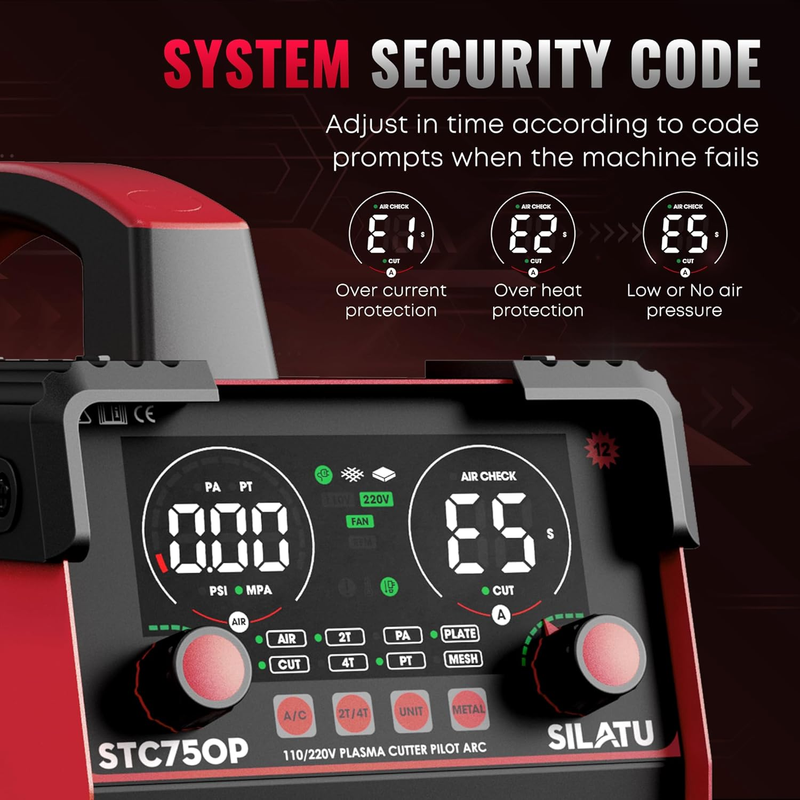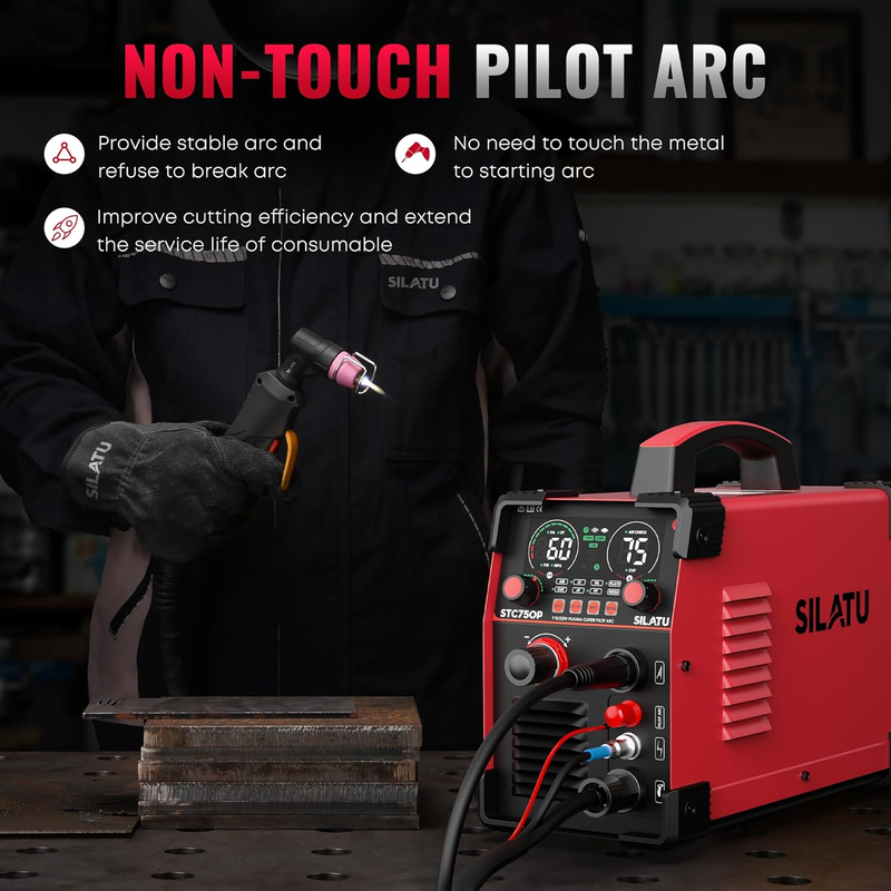 Non Touch Pilot Arc Plasma Cutter: The STC750P plasma cutter with pilot arc function, It?s a high-frequency non-contact arc starting method, This means the torch head doesn't need to make contact with the metal plate. With the addition of a PA (Pilot Arc) adjustable function, the maintenance time of the pilot arc is extended, reducing energy consumption during non-cutting periods and minimizing electrode wear, extend consumables life