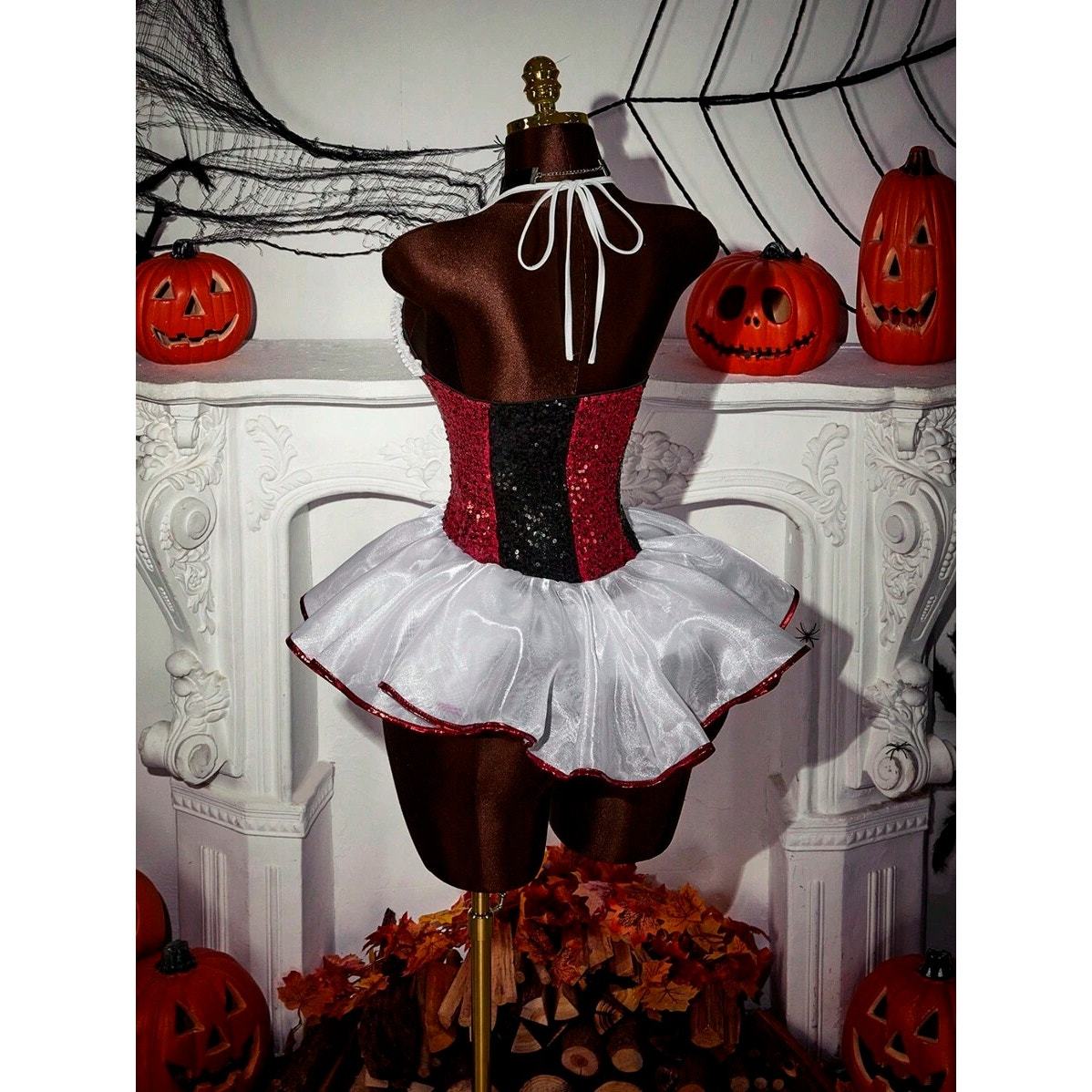 Steal the spotlight this Halloween with this flirty and fun Harlequin Sequin Tutu Costume! Inspired by the iconic jester aesthetic, this striking one-piece outfit features bold black and red sequin panels, a diamond-checkered front design, and a voluminous white tutu-style skirt. The halter neckline and sweetheart bustline offer a flattering, feminine silhouette perfect for parties, cosplay events, or themed photo shoots.