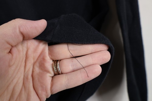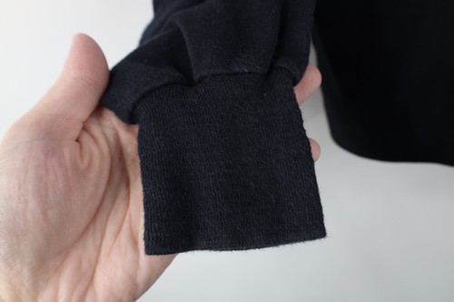 Blemishes throughout. Loose threads bottom left side. Collar, cuffs discolored. Dark spots, pilling. Color faded. Tag partially unstitched