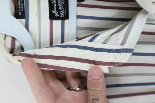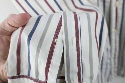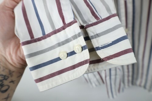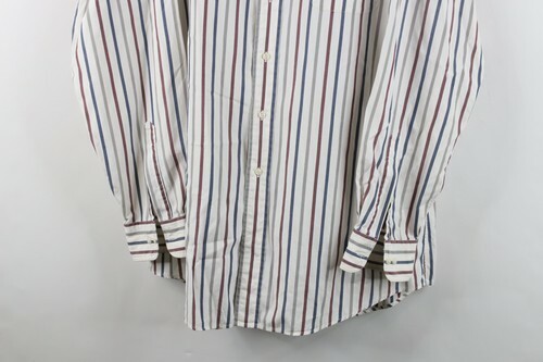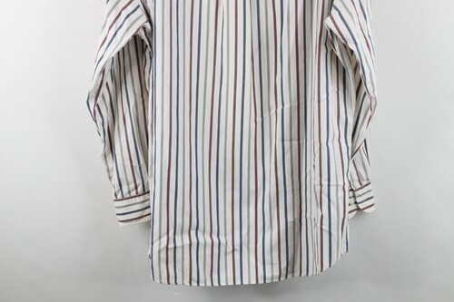 Blemish front middle. Stains back top. Missing button right arm. Loose threads inner collar, cuffs. Collar, cuffs discolored. Yellowed