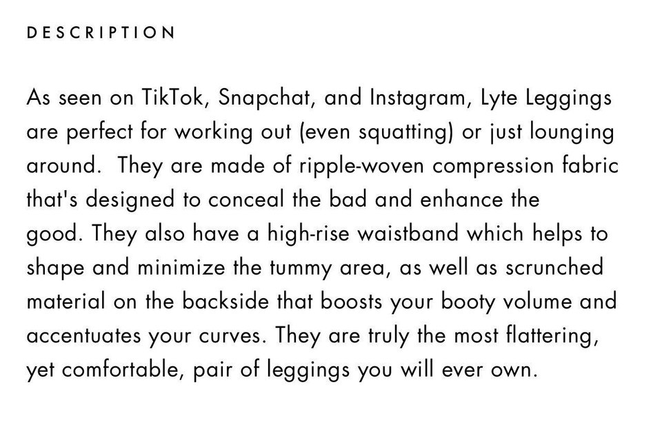As seen on TikTok, Snapchat, and Instagram, Lyte Leggings are perfect for working out (even squatting) or just lounging around. They are made of ripple-woven compression fabric that's designed to conceal the bad and enhance the good. They also have a high-rise waistband which helps to shape and minimize the tummy area, as well as scrunched material on the backside that boosts your booty volume and accentuates your curves.