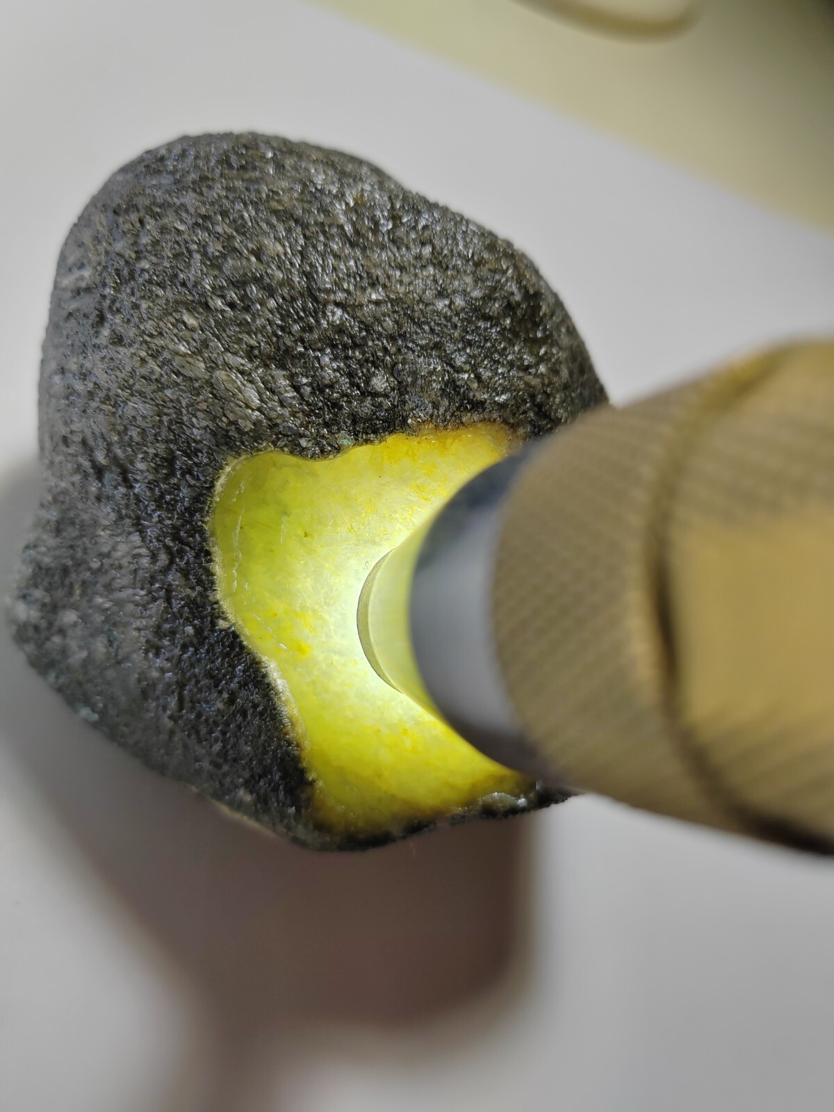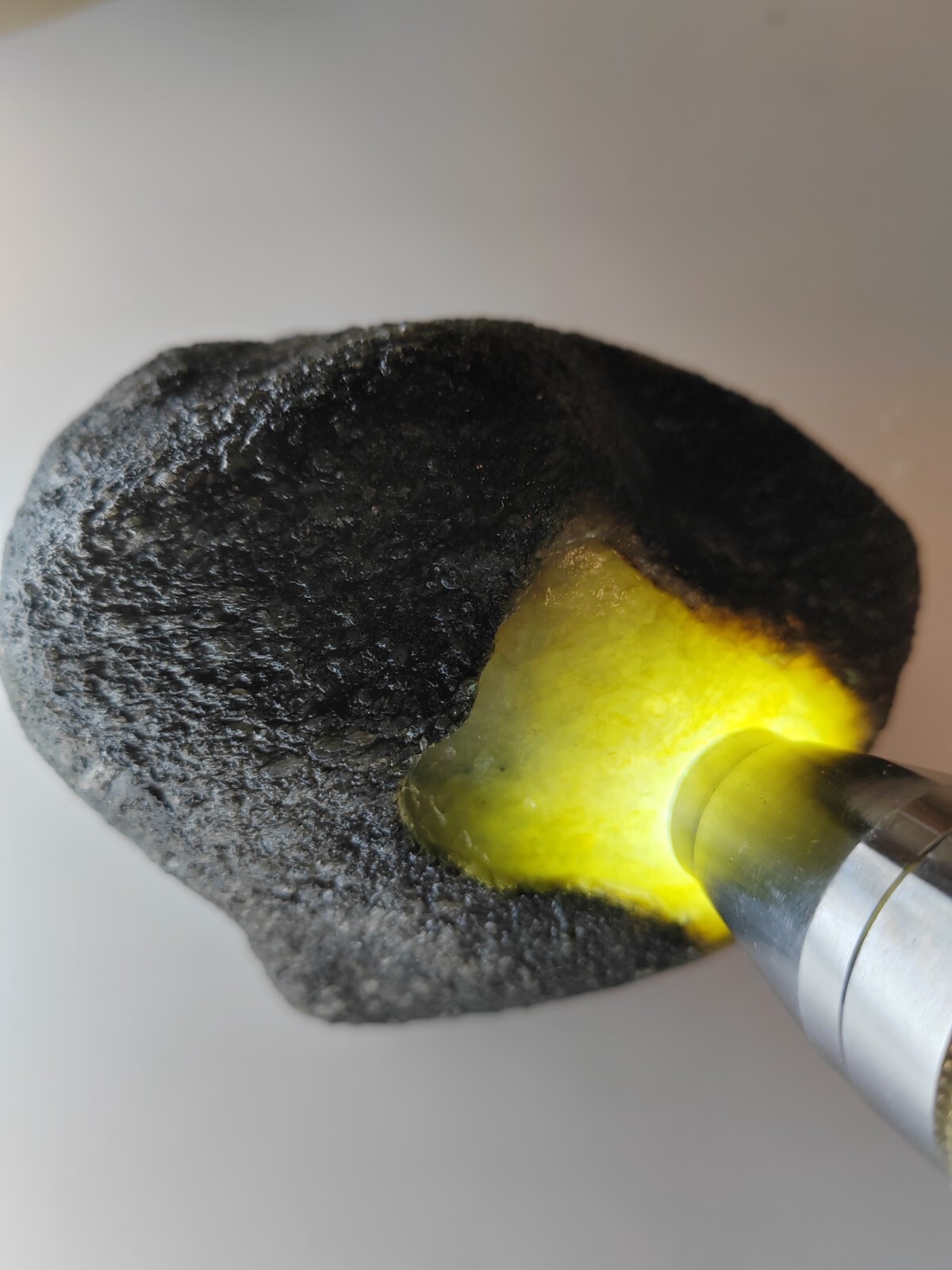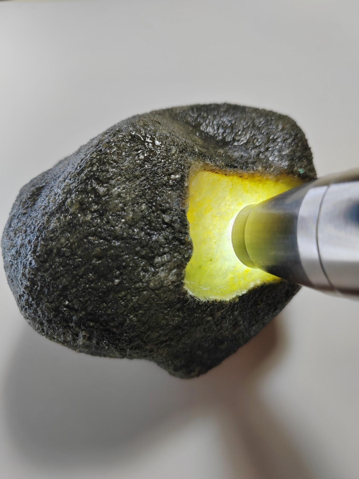 This natural Burmese jadeite specimen is highly esteemed among collectors. It belongs to the variety of "Ice Type Light Yellow Green," delicately showcasing its fine texture and subtle light yellow green hue through localized openings. In the realm of Burmese jadeite, yellow green is revered as the supreme color, prized not only for its vibrant appearance and exceptional durability but also for its universal suitability, transcending distinctions of identity, status, age, or gender. Jewelry crafted from this ice light yellow green jadeite exudes an air of romance and mystique, inviting contemplation and nostalgia. With its rarity and the ever-increasing demand within the collector's market. Therefore, jadeite is hailed as the "King of Jade," not only representing an investment opportunity with significant potential but also serving as a means of preserving value or being fashioned into high-end jewelry. Measuring approximately 87.10mm x 76.50mm x 59.90mm and weighing 557 grams, equivalent to 2785 carats. Such a precious item is destined to become a prideful possession for any collector, emanating captivating charm and carrying a rich tapestry of history and emotion.