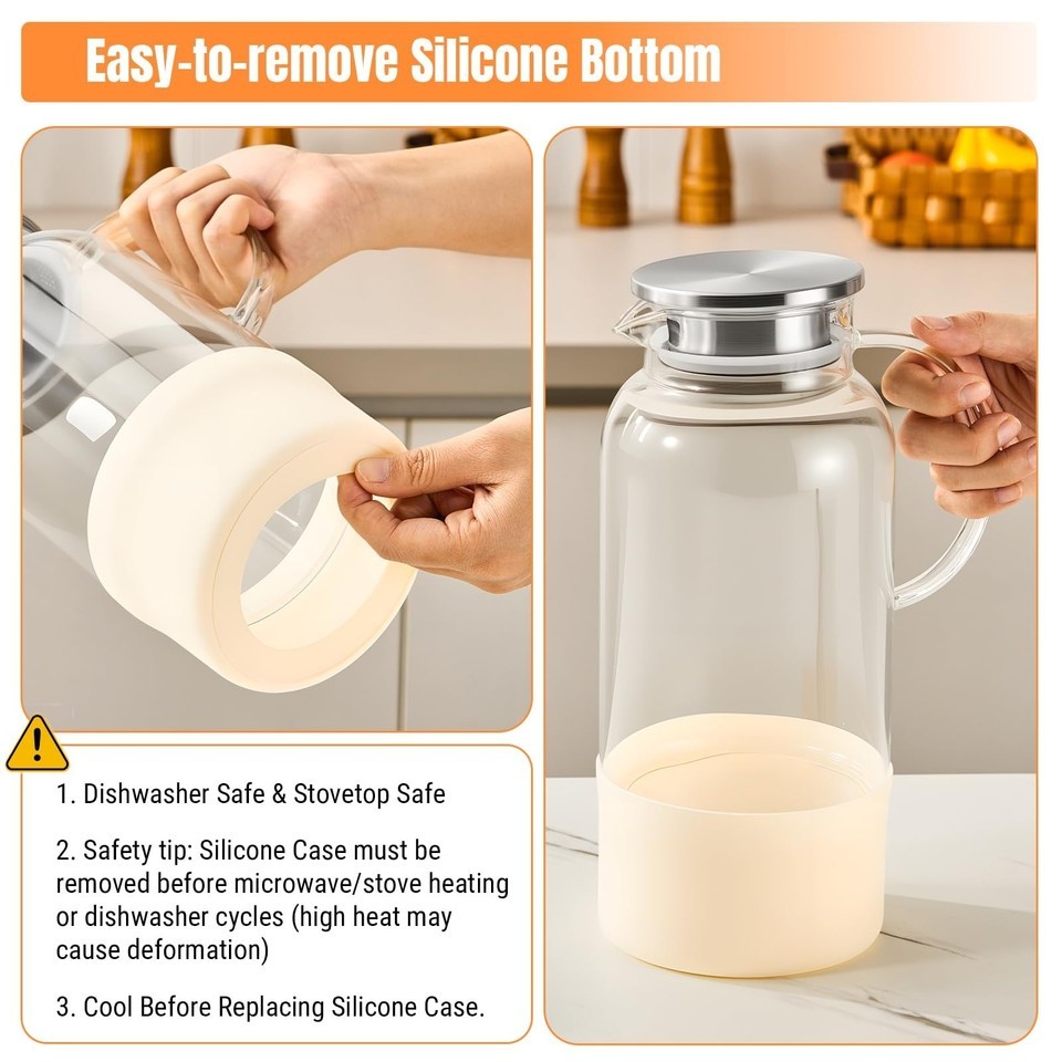 Non-Slip Detachable Silicone Base: The removable silicone sleeve adds stability and protects surfaces, making this glass pitcher with lid both safe and scratch-resistant.