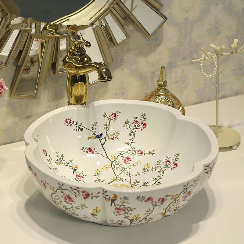 Hand Painted Flower and Bird Ceramic Vessel Sink, Round Above Counter Art Basin
