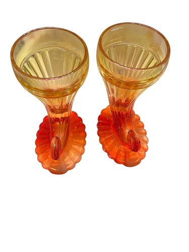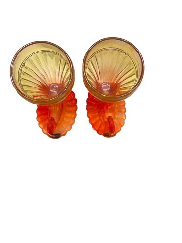 Vtg Pair Jeanette Glass Horn Of Plenty Vases, Amberina Yellow to Red, 5.5" Tall