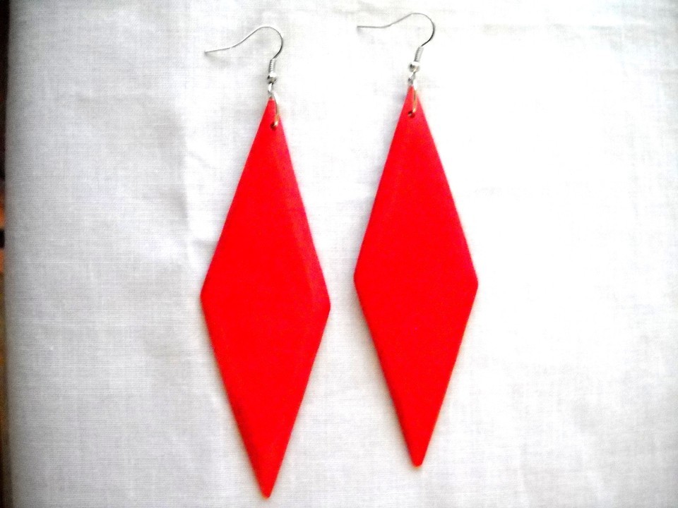 X-LARGE BOLD BRIGHT RED PAINTED WOOD POINTS TRIANGLE DIAMOND SHAPED EARRINGS