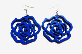 NAVY BLUE ROSES OPEN ROSE FLOWER UNIQUE COLOR WOODEN DANGLING FLORAL EARRINGS