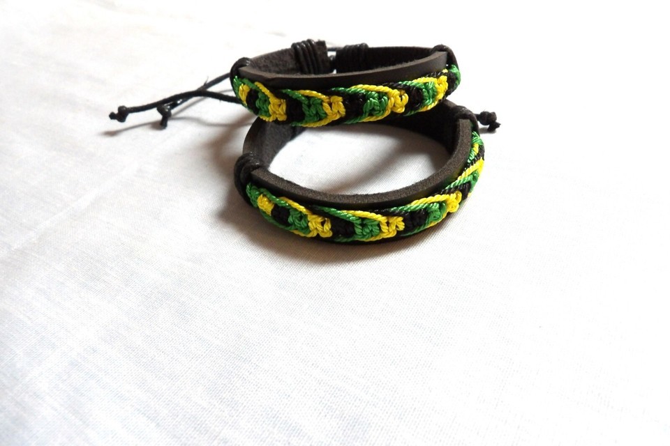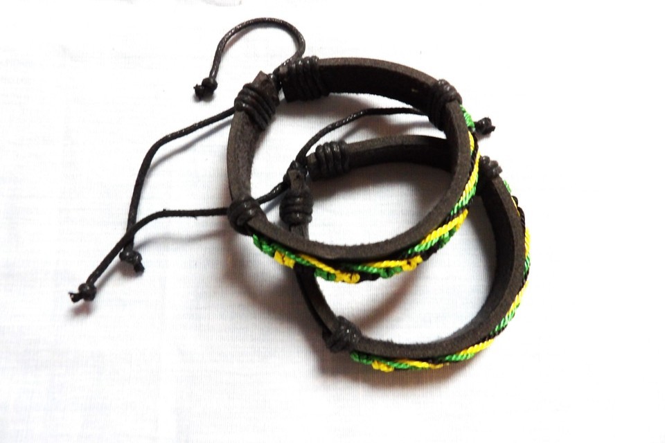 Set of 2 JAMAICA COLORS GREEN YELLOW WOVEN CORD ON BLACK LEATHER ADJ BRACELETS