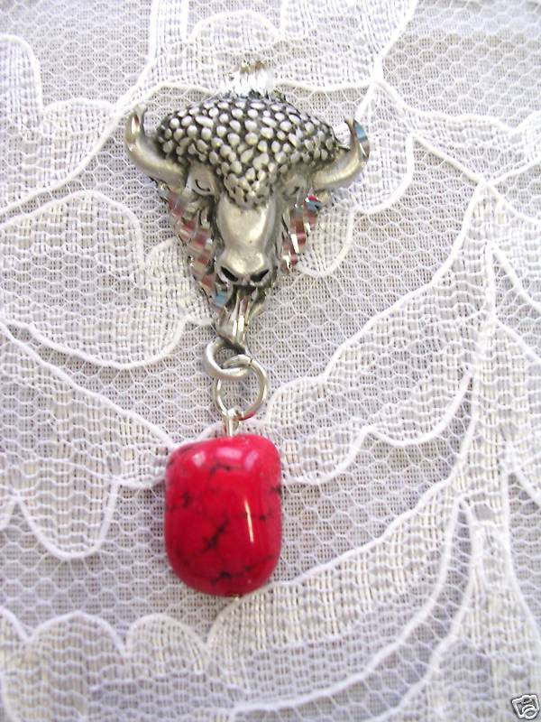HAND ENGRAVED TOTEM SPIRIT BUFFALO HEAD w RED TURQUOISE GEM PENDANT NECKLACE