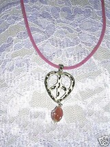 HAND ENGRAVED PEWTER HEART SHAPED PEACE SIGN PINK GLASS DANGLE PENDANT NECKLACE