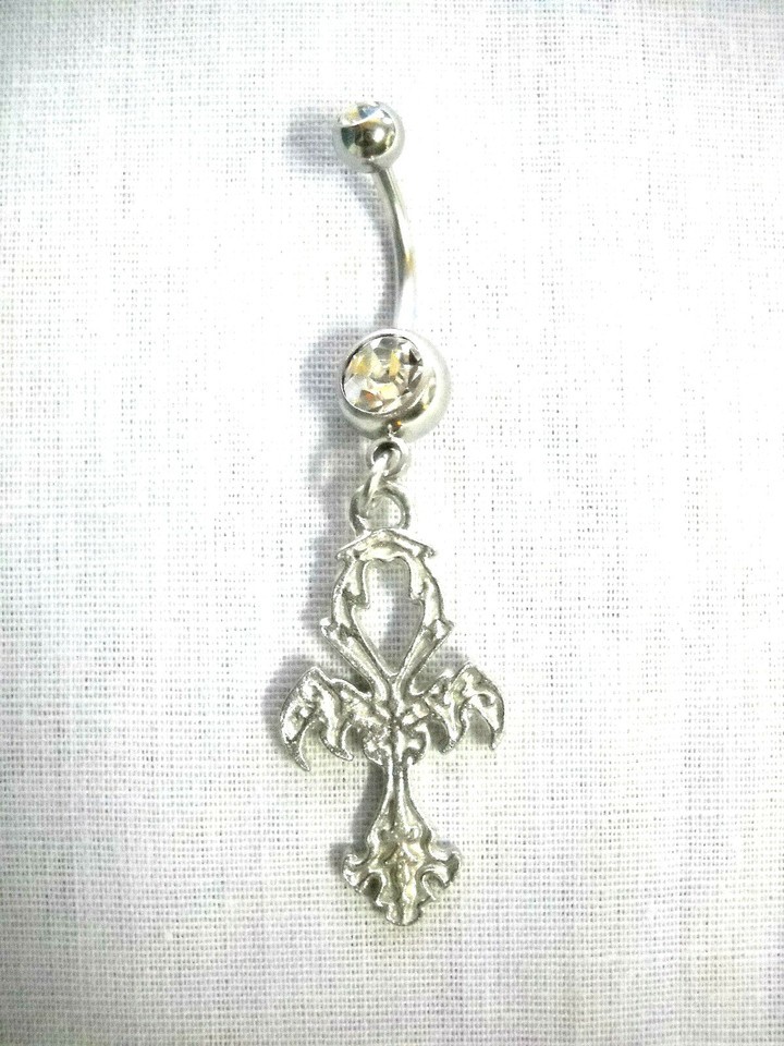 EGYPTIAN ANKH ETERNAL LIFE SYMBOL DECO CHARM on 14g CLEAR CZ BELLY RING BARBELL