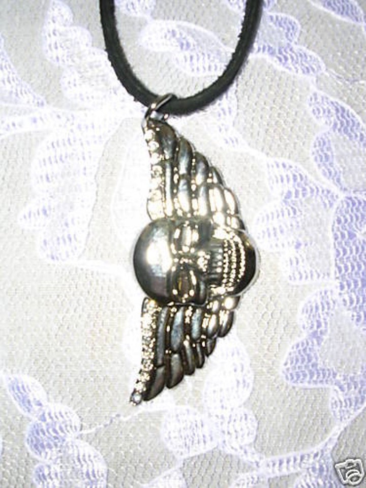 NEW CHROME PLATE OPEN WINGS & SKULL w RHINESTONES BIKER PENDANT ADJ NECKLACE