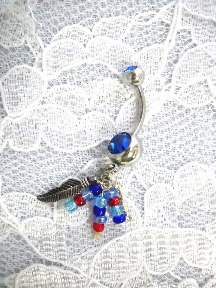 STERLING SILVER FEATHER & SEED BEAD TASSLES 14g DEEP BLUE CZ BELLY RING BARBELL