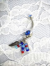14 gauge surgical stainless steel navel ring with a STERLING SILVER FEATHER CLUSTER WITH 3 SEED BEAD TASSELS DANGLING IN RED, BABY BLUE COBALT BLUE A SILVER BALL CHAIN with A DOUBLE COBALT BLUE GEM CZ STONE BANANA BAR