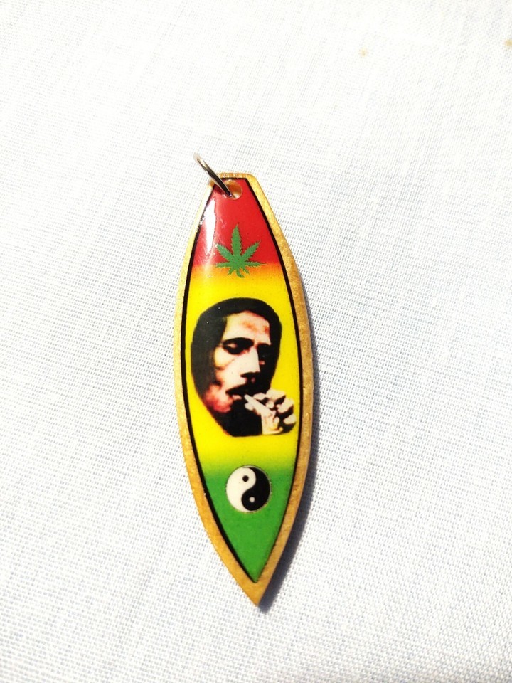 BOB MARLEY TOKING PHOTO REGGAE POT LEAF YIN YANG WOOD SURFBOARD PENDANT NECKLACE