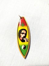 RASTA COLORS - YELLOW - RED - GREEN REAL WOOD SURFBOARD SHAPE WITH A COLOR PORTRAIT PHOTOGRAPH OF BOB MARLEY MUSIC MAN TOKING SUPER DETAILED WITH POT LEAF YIN YANG SYMBOLS WOODEN PENDANT